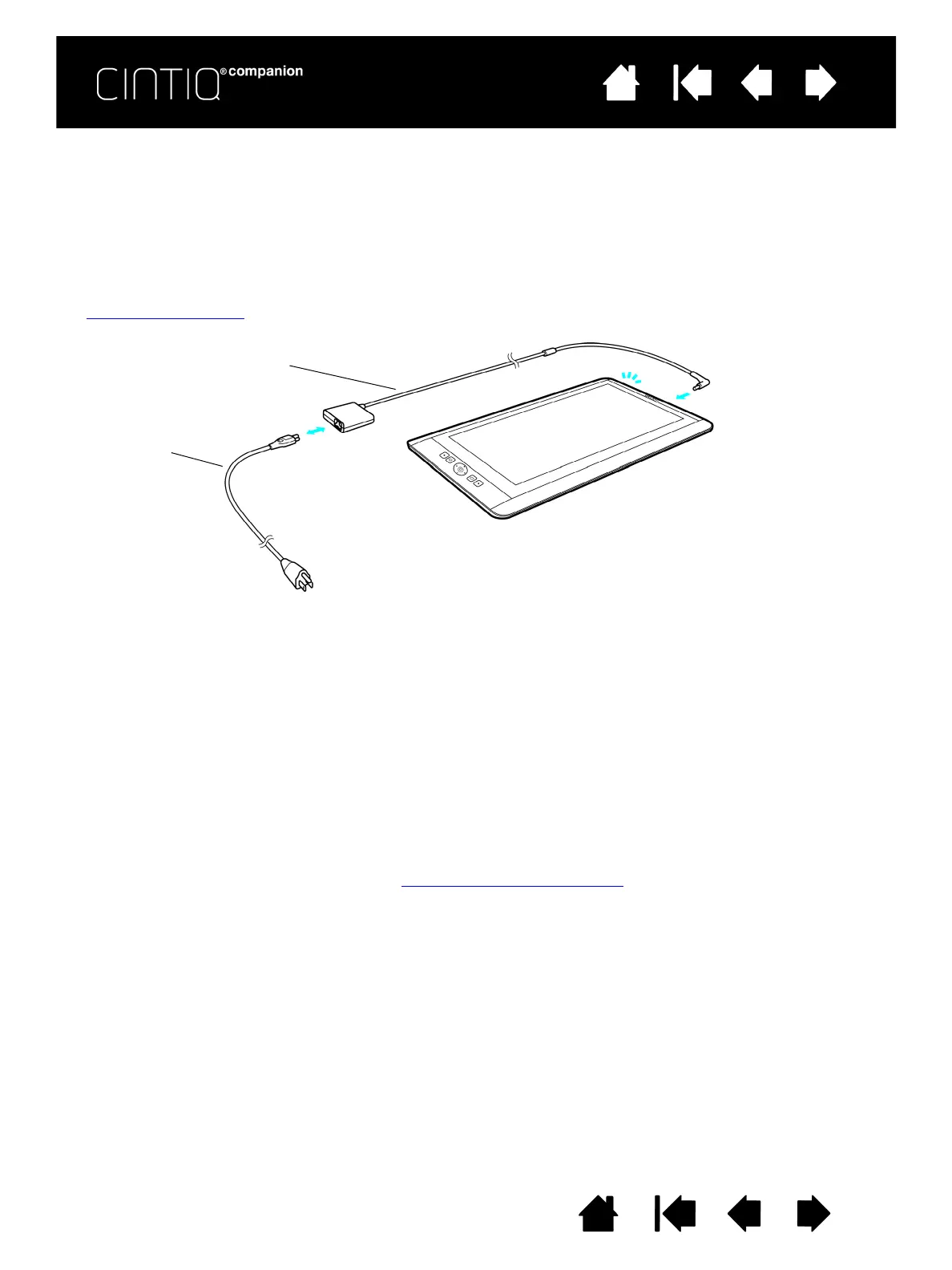 1. For the first use of your Cintiq, connect it to a power source using the power cable and AC adapter. See