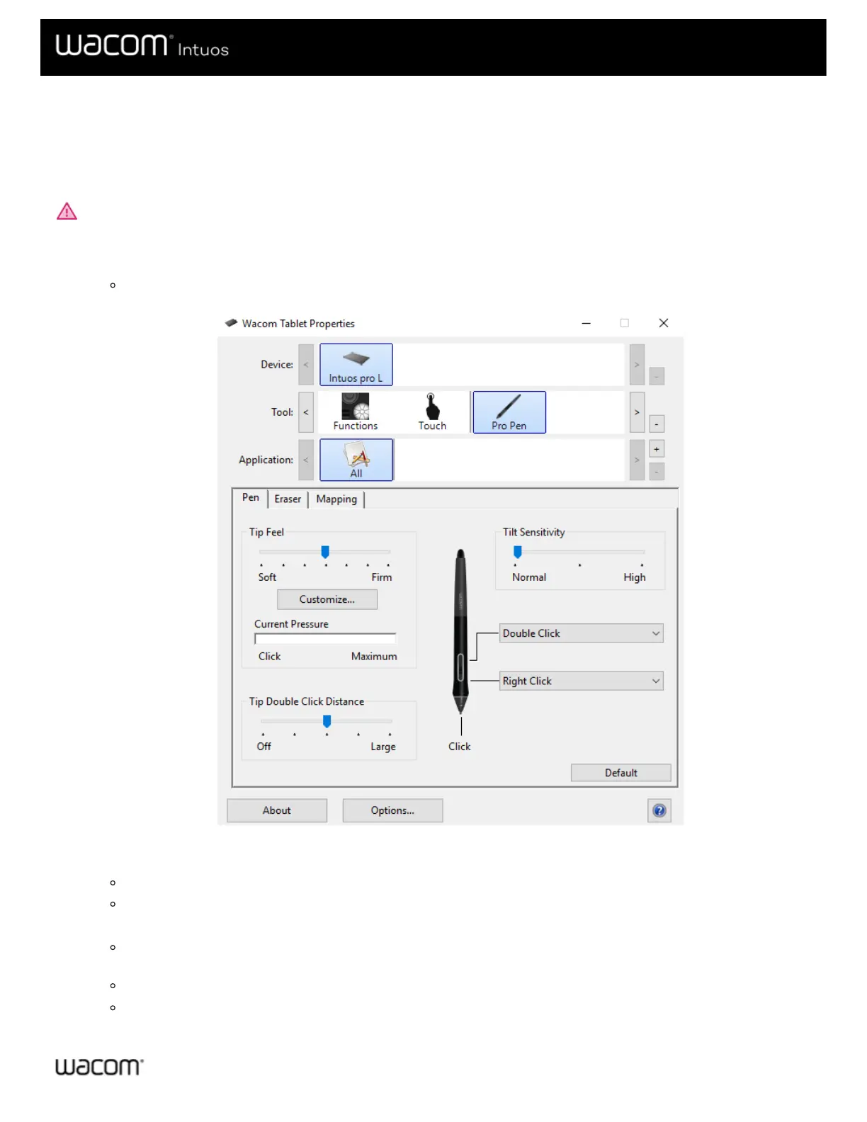 Important: The customizable components and the options available in Wacom Tablet Properties will vary depending on your