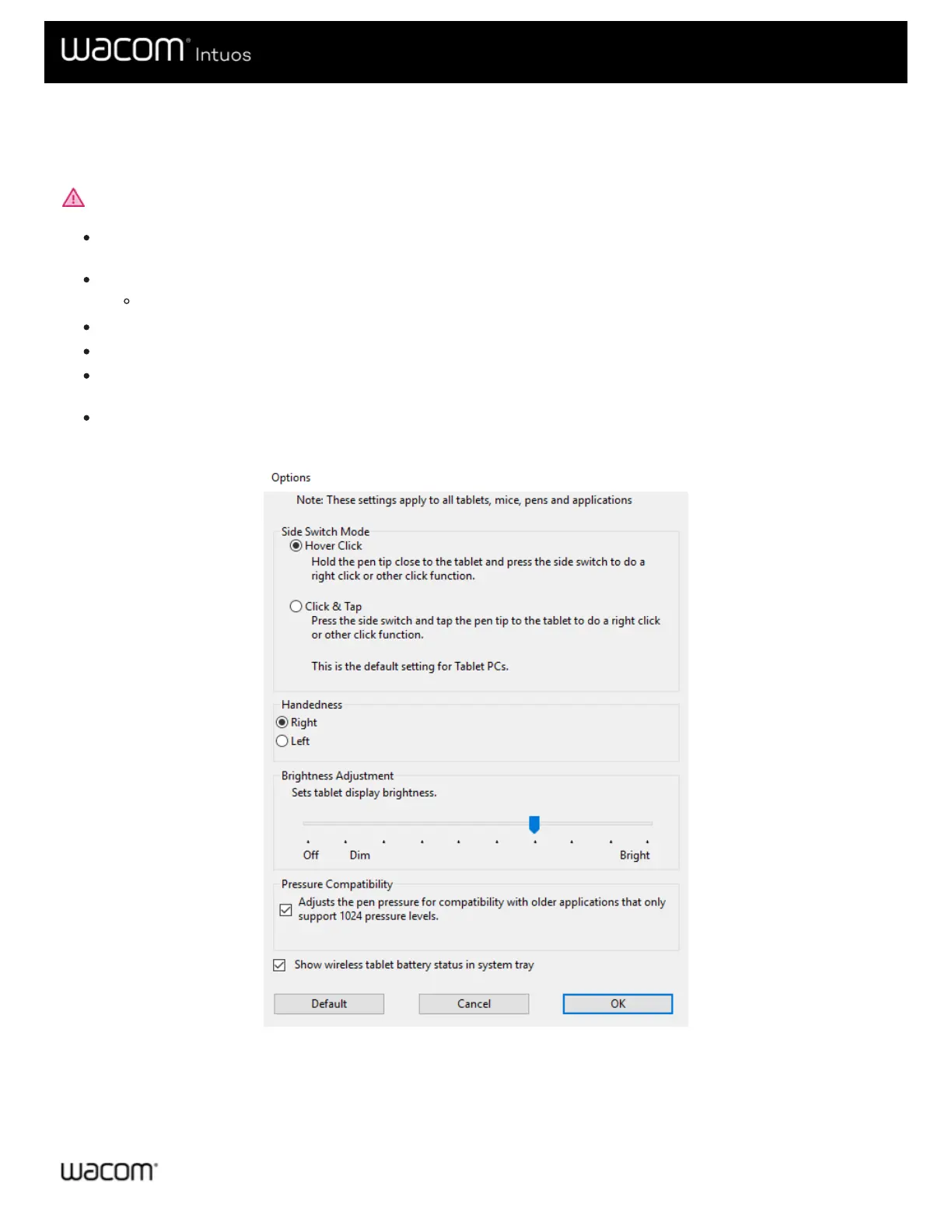 Click on Options in Wacom Tablet Properties to customize side switch mode and other preferences for your device.