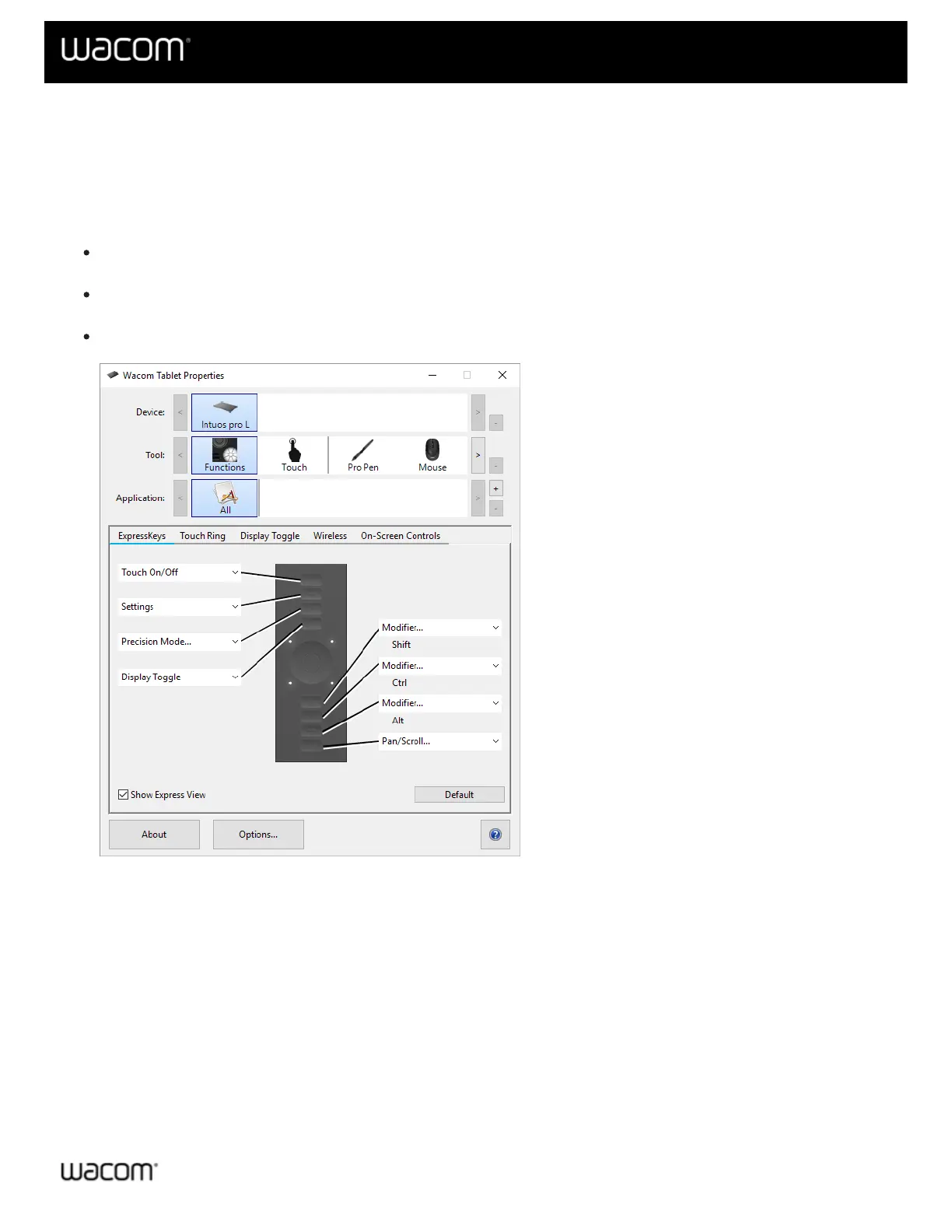Select the application, then customize the Wacom Tablet Properties tab settings for your tool and application.