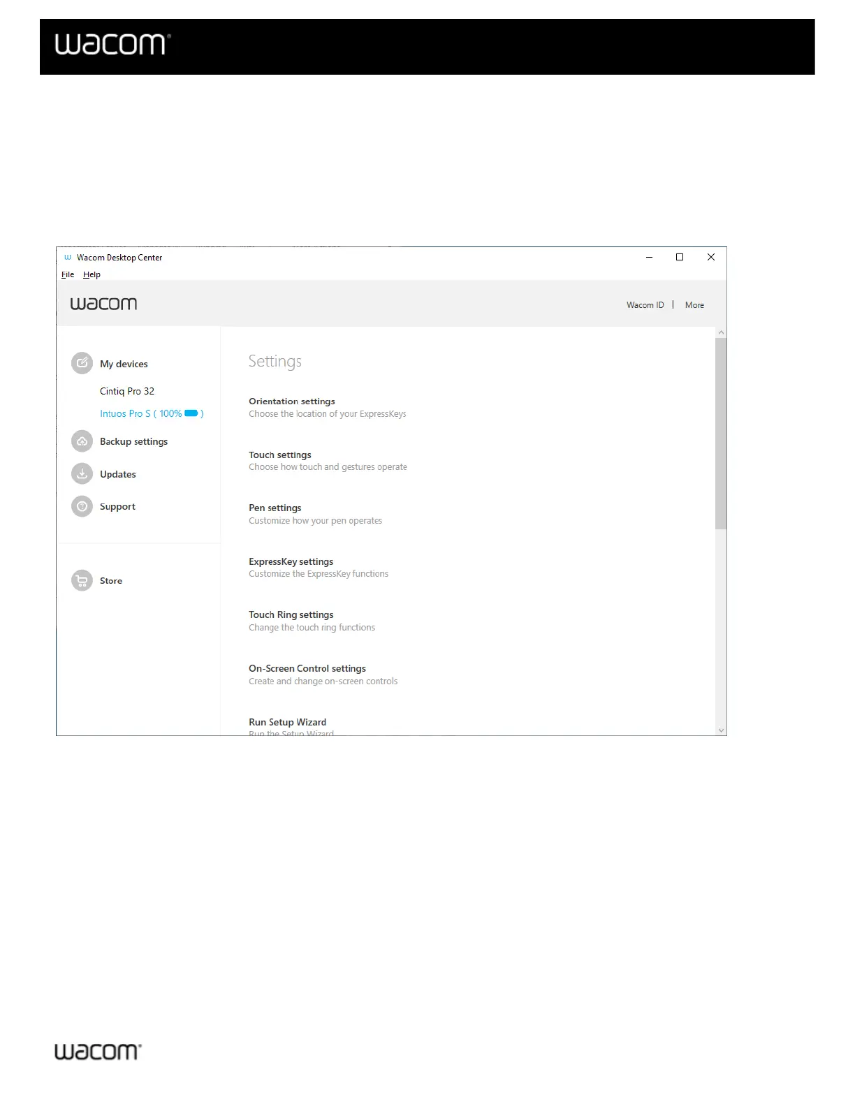 Clicking on My Devices in the Wacom Desktop Center main menu will display the supported Wacom device(s)
