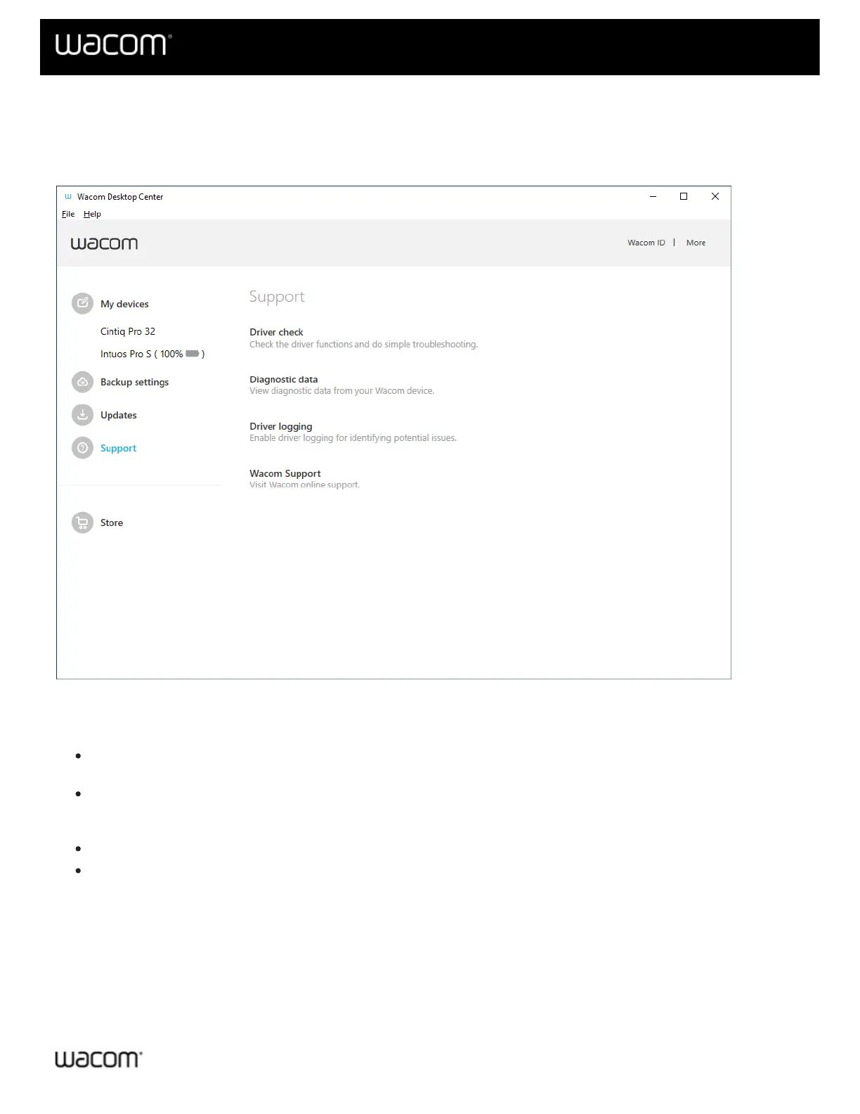 The Support section of the Wacom Desktop Center allows you to check driver functions, view diagnostic data,
