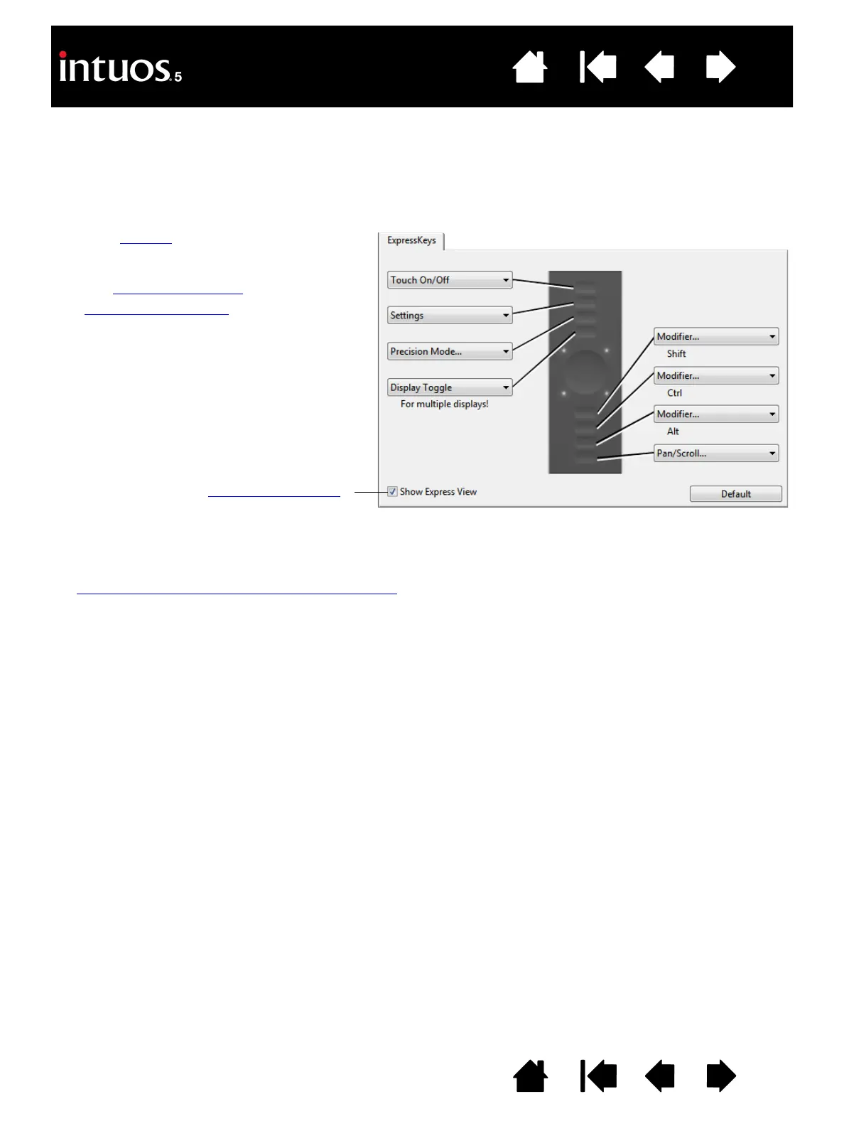 To customize the ExpressKeys, select the EXPRESSKEYS tab. Each key can be customized to perform a