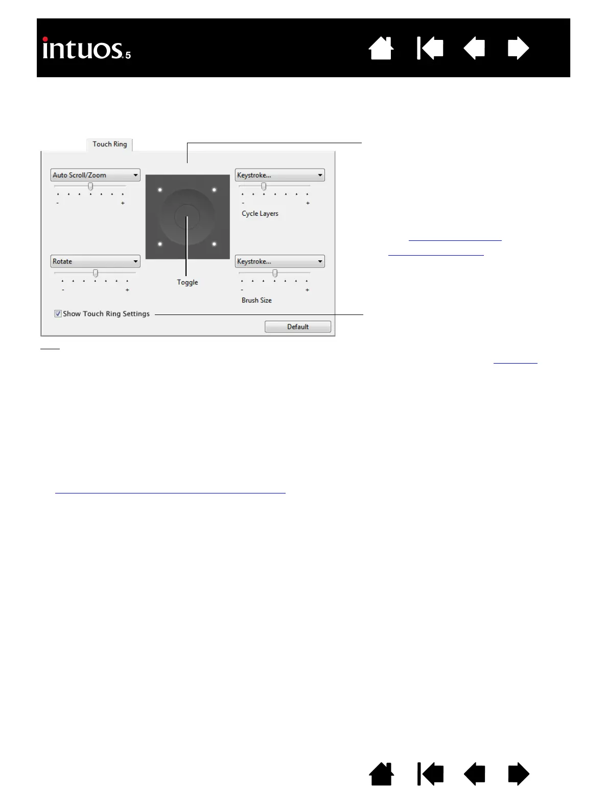 • To set the brightness of the Touch Ring status LEDs and active area markers, click the O