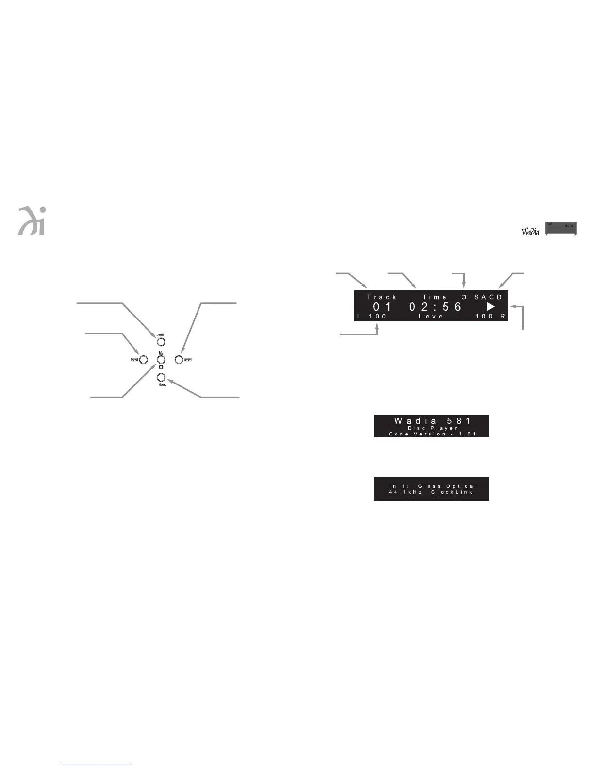 The Wadia 581 Disc Player features a large display screen. The top section shows the status of the transport.