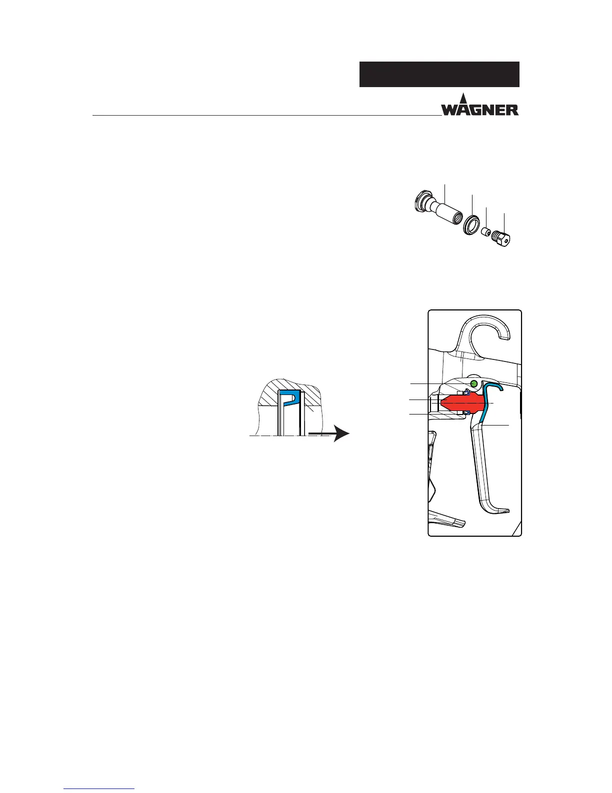 5. Carefully insert the complete valve rod (B) into the gun housing.