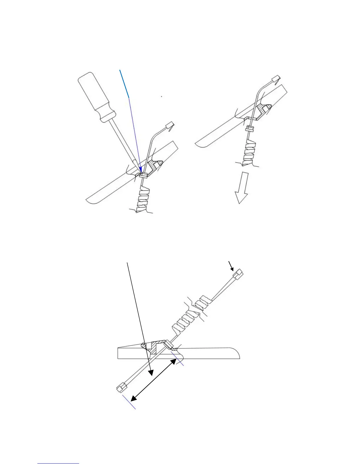Rotate strain relief so latch is accessible then depress with screwdriver.