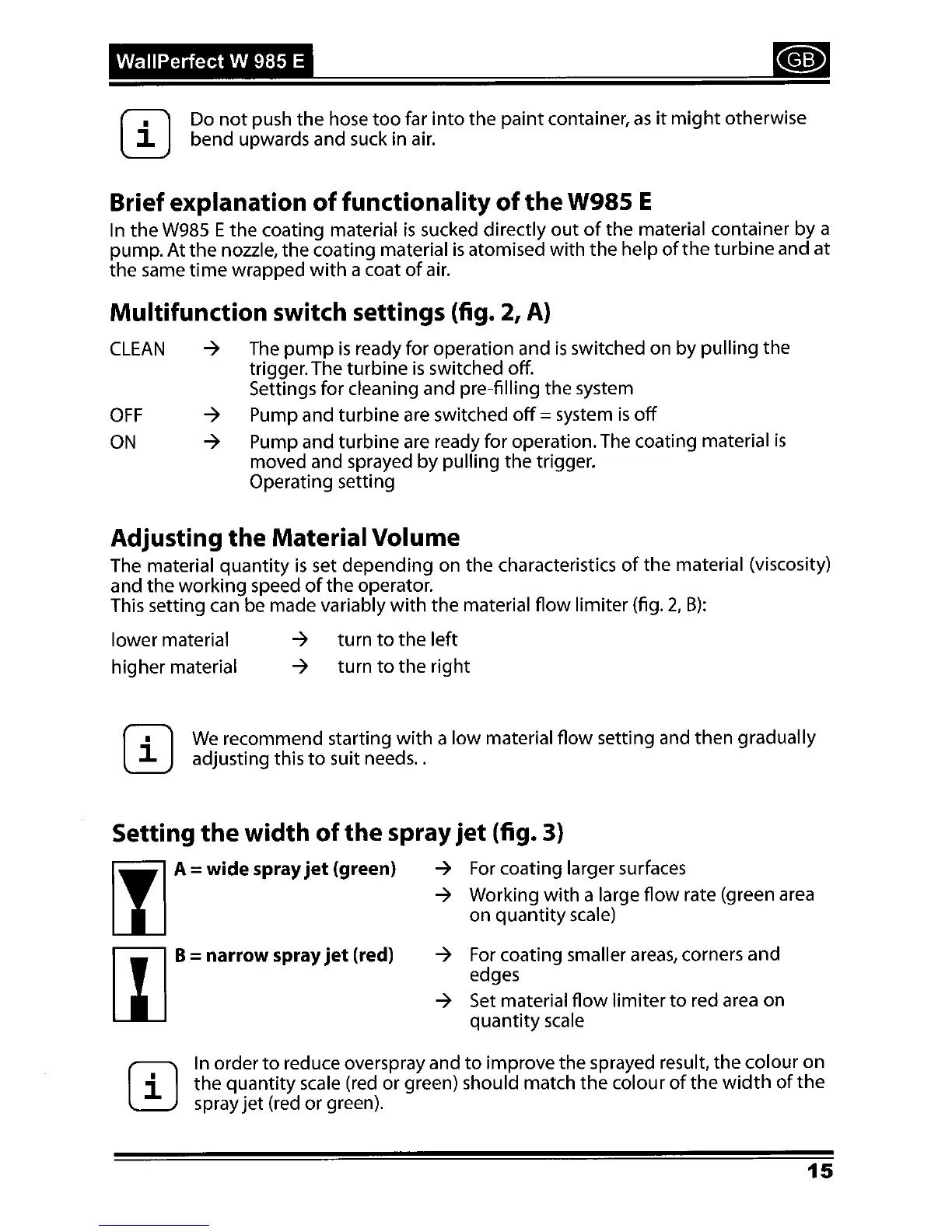 WAGNER WallPerfect W 985 E - Functionality and Operation; Multifunction Switch Settings; Adjusting Material Volume; Setting Spray Jet Width