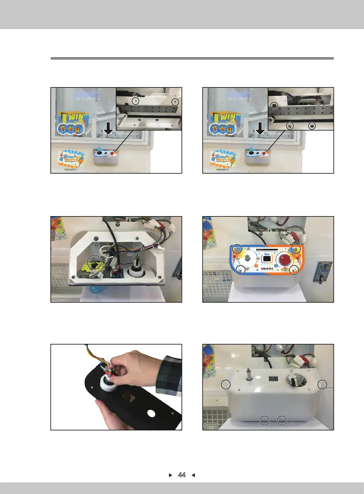 1. Turn off the game-machine. Open the acrylic door with the key, remove the screen and 2
