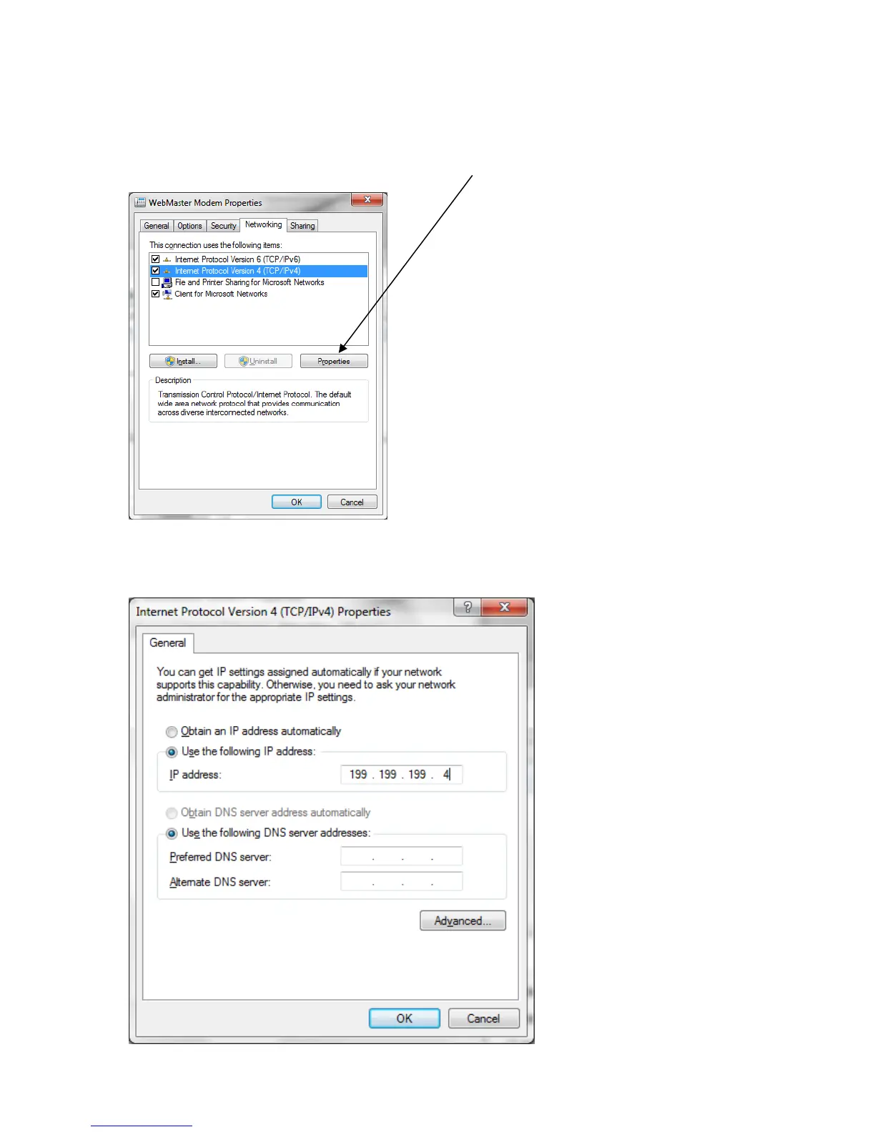 Select ‘Use the following IP address’ and change the IP address to 199.199.199.4