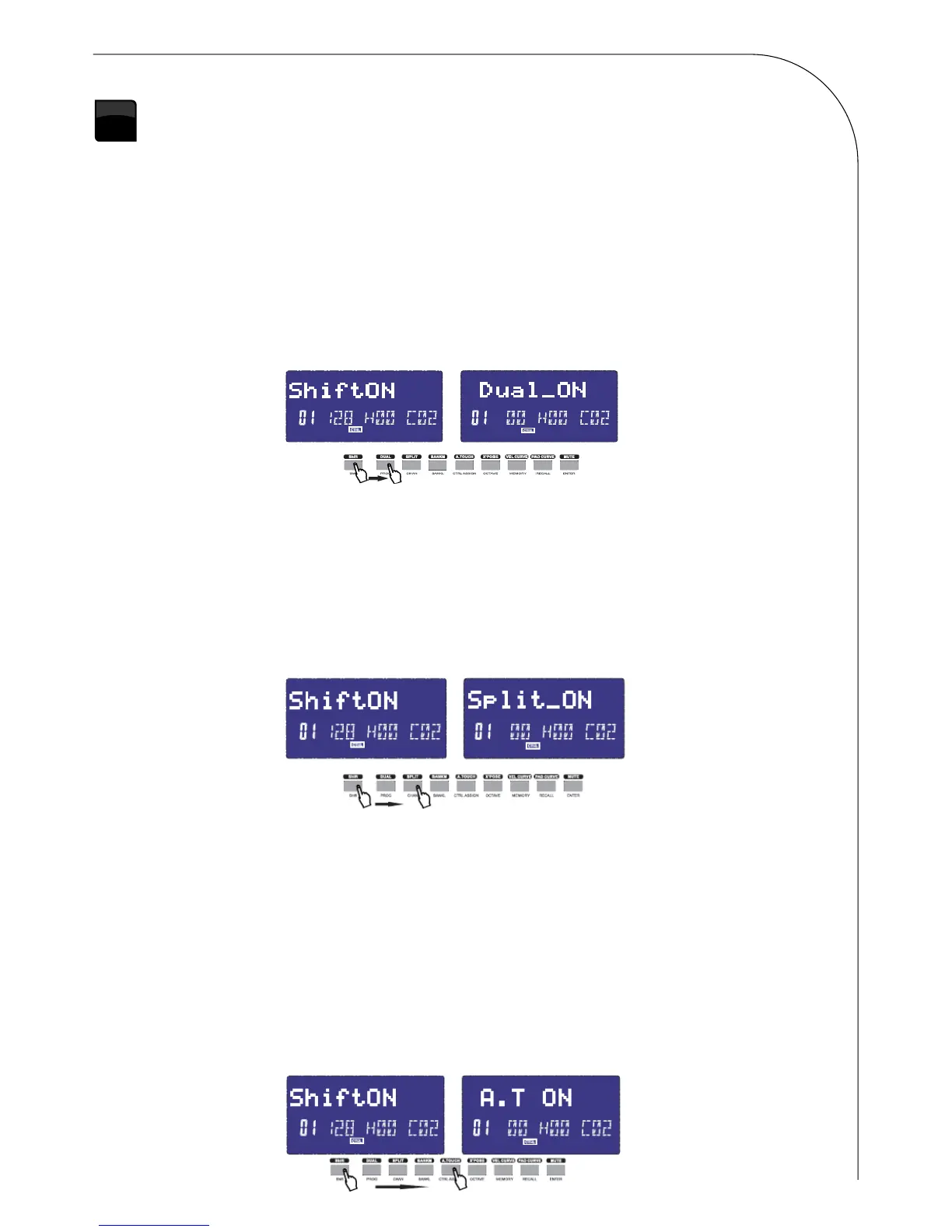 o LCD mostra “DUAL ON”. O teclado envia info MIDI