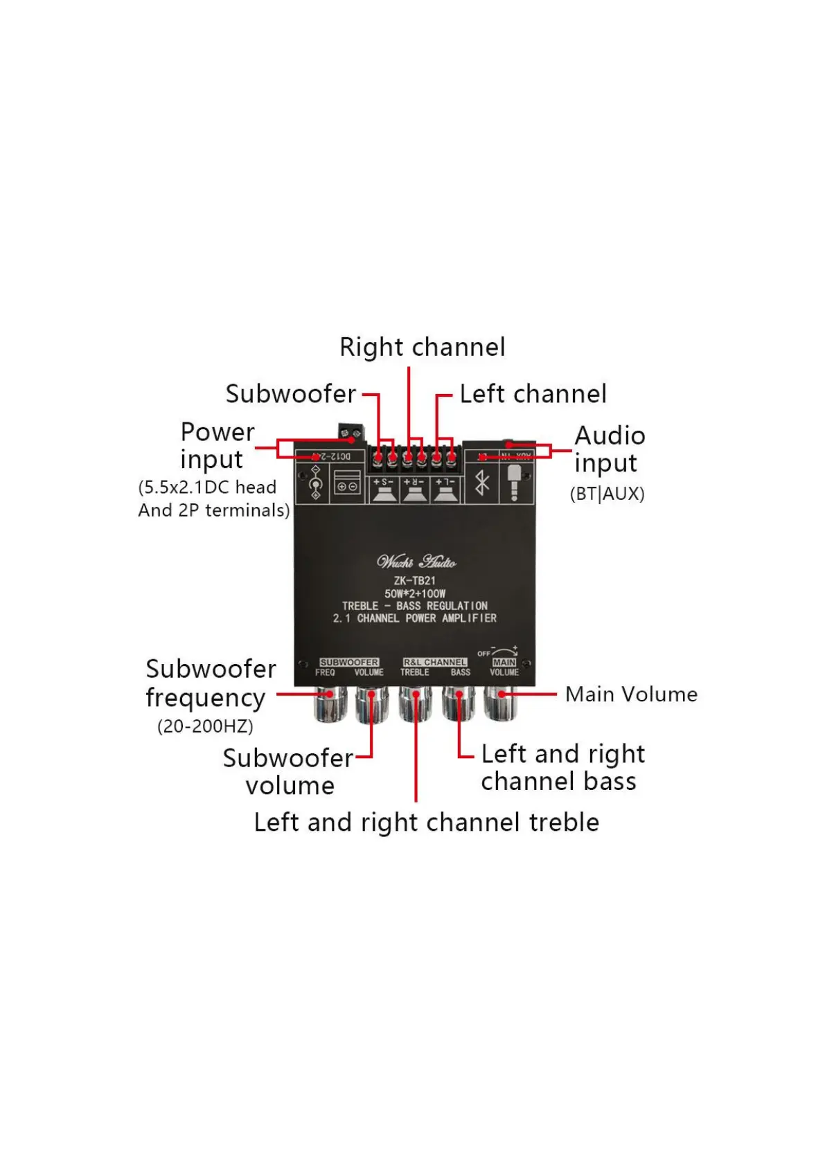 Walfront ZK-TB21 - Product Functionality Overview; Audio Input Options; Channel Output Configuration; Control Knobs and Tone Adjustment