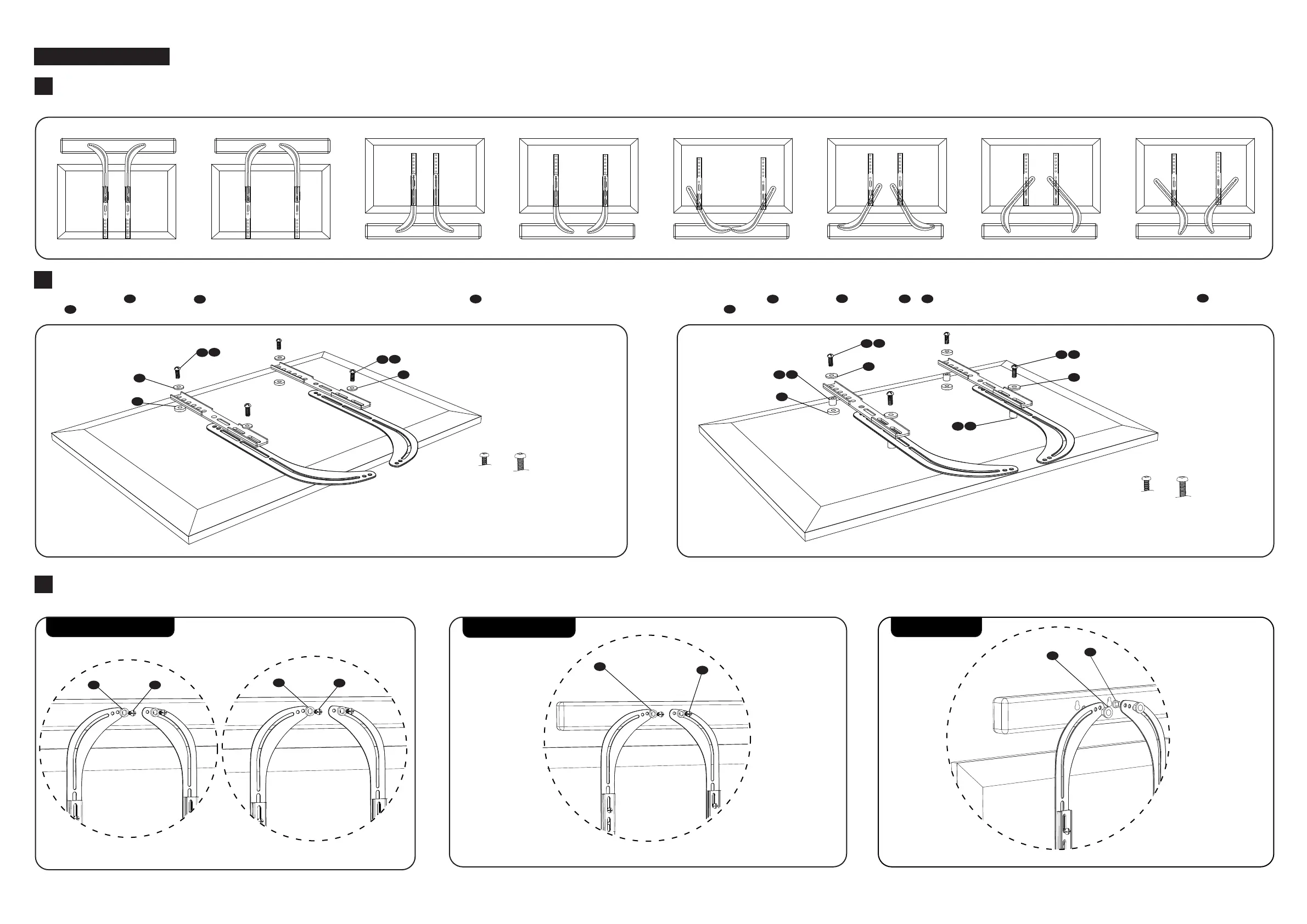 Assemble Soundbar with the Bracket and VESA brackets from your TV mount to TV. According to the distances of the TV & Soundbar mounting holes, select the appropriate mounting positions on the Bracket. Rotate or turn over the Bracket for the best mounting solutions. The Bracket should be mounted