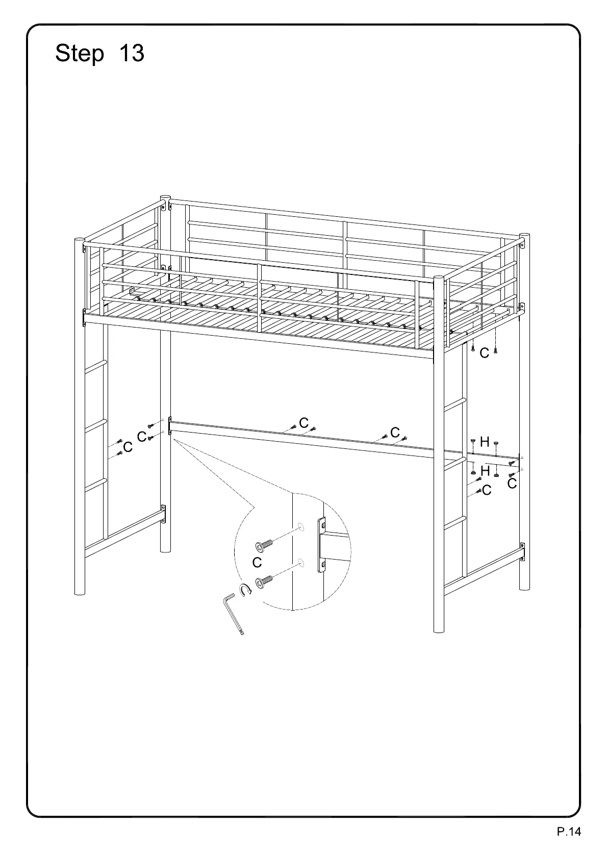 Screw small bolts (C) and insert plastic plugs (H) into the bunk bed assembly.This will fill the