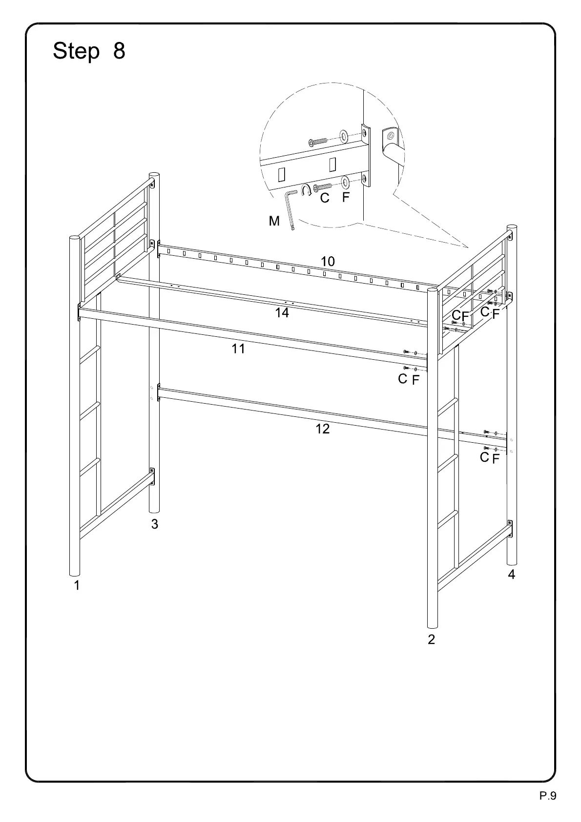 Attach crossbars (10,11,12,14) to the assembly from Step 6 using small bolts (C) and small