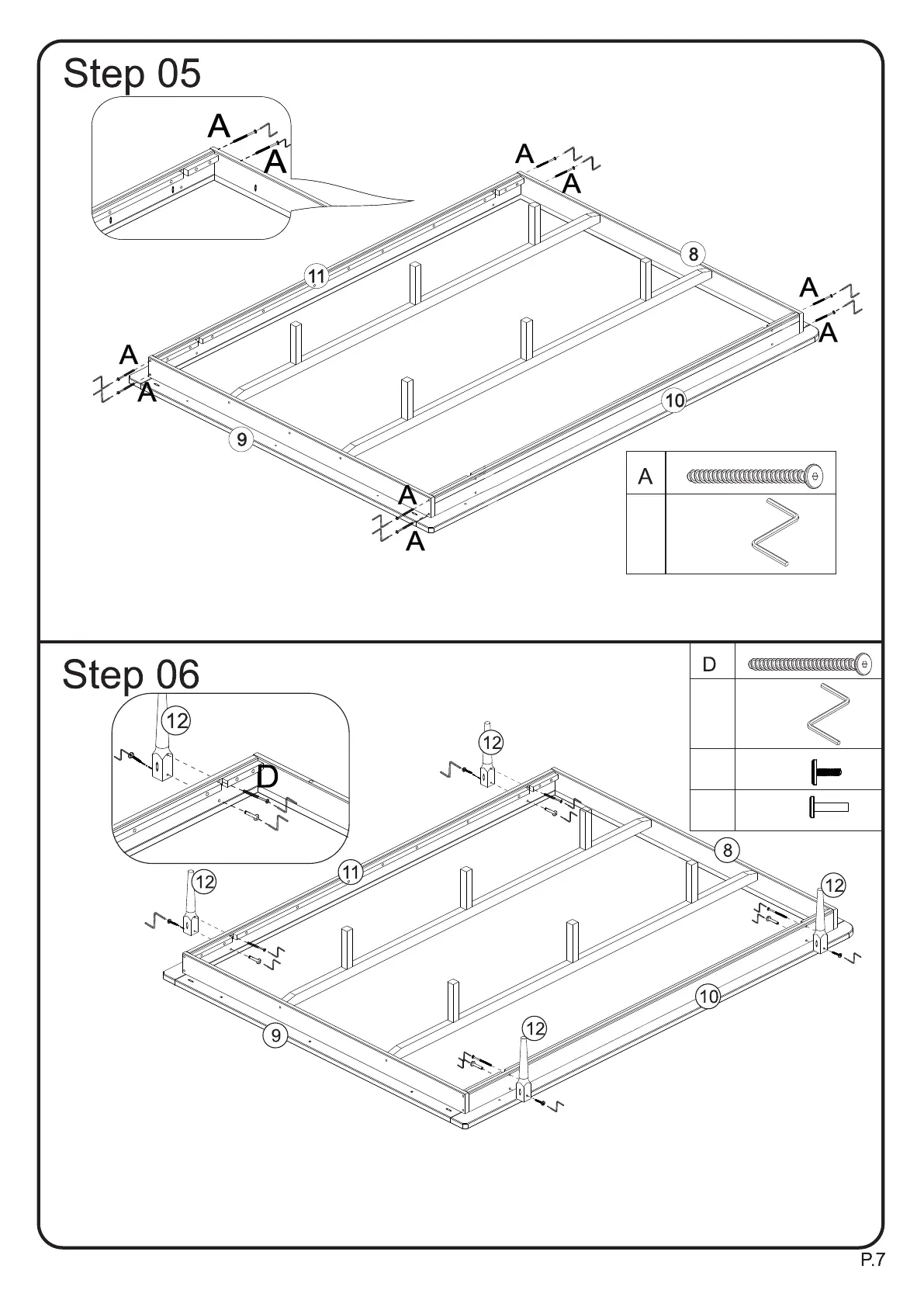 at the same time. The use Screw (D) and hex key (J) to secure legs(12).