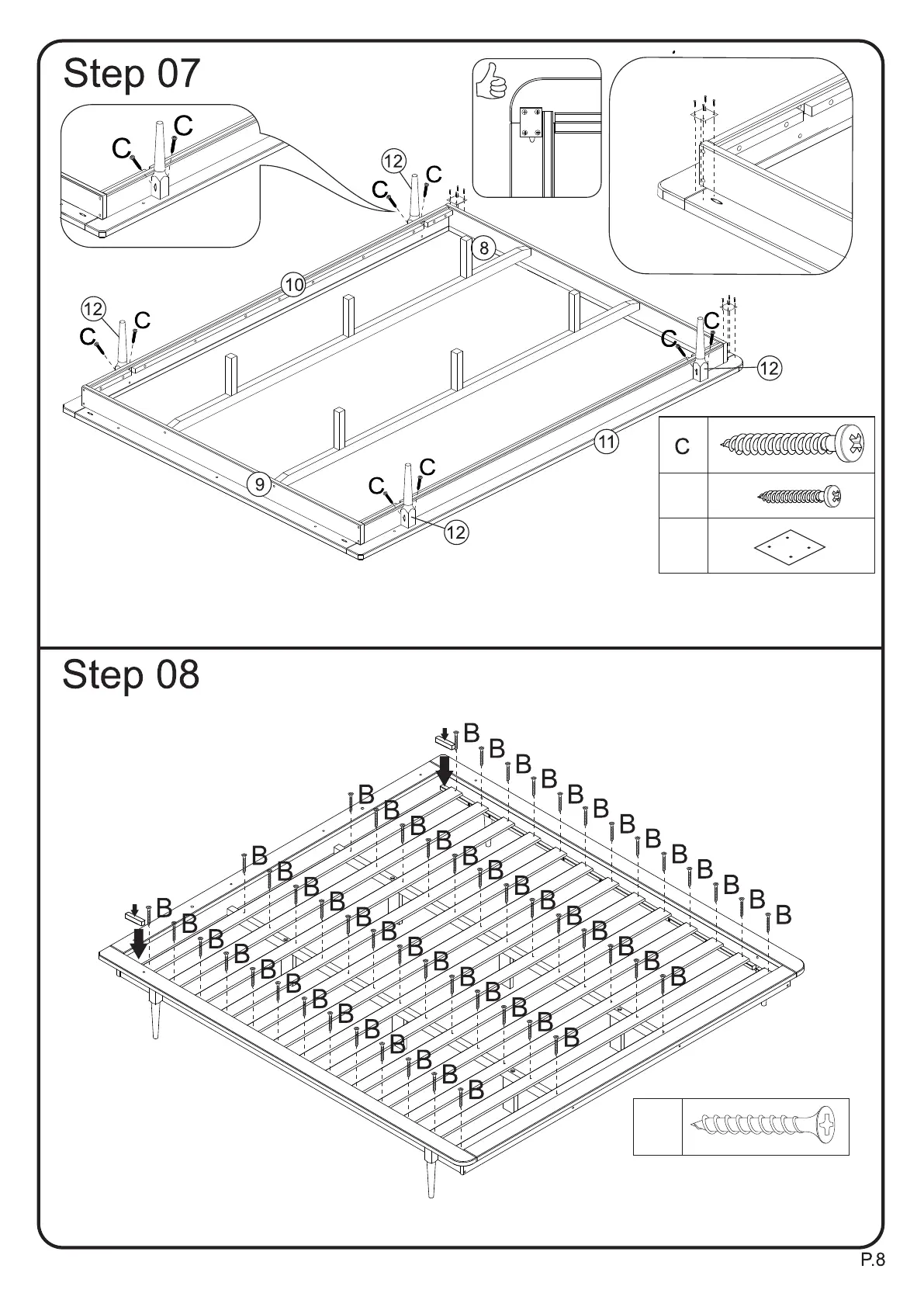 Secure feet to frame using screw(C).