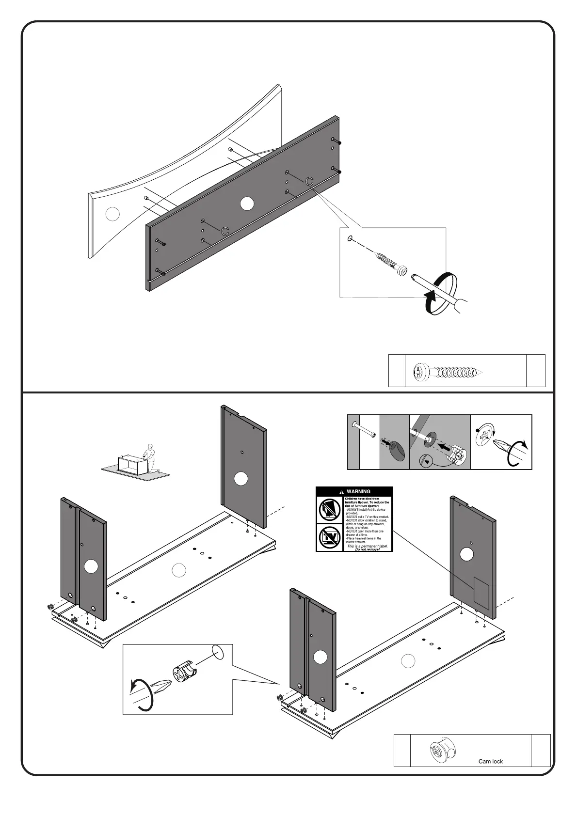 with Cam lock (K) and Philips head screwdriver.