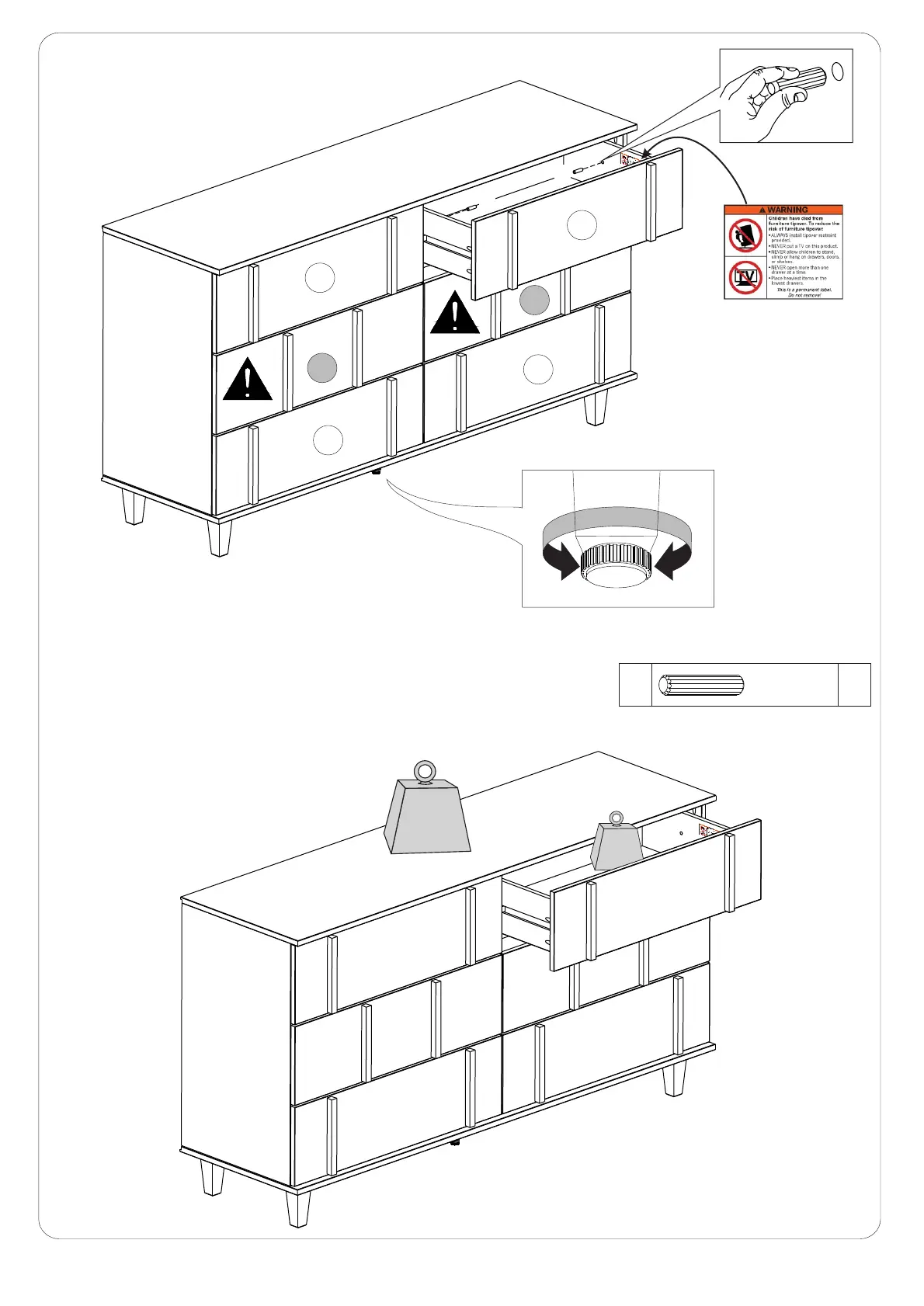Insert wood dowel (A) on the inside of all drawers while
