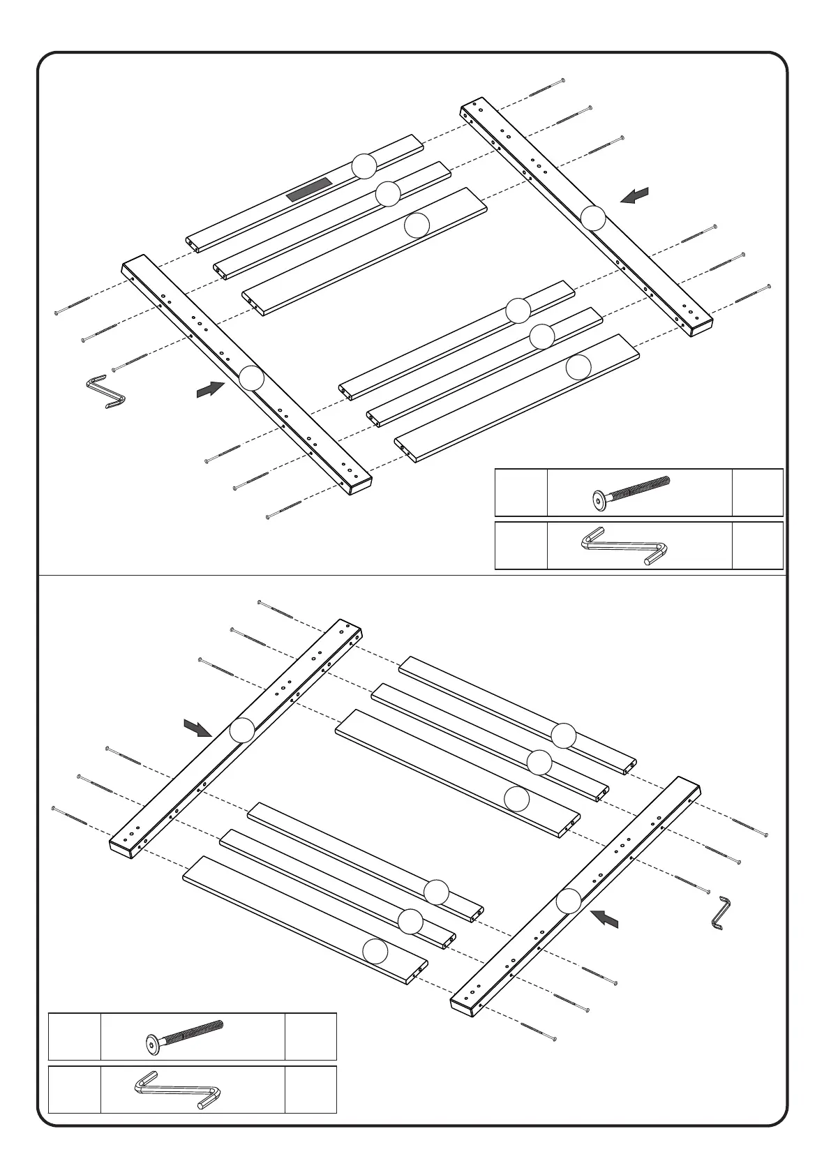 Attach legs (2,4) to slats (10 and 13) using screws (H) and