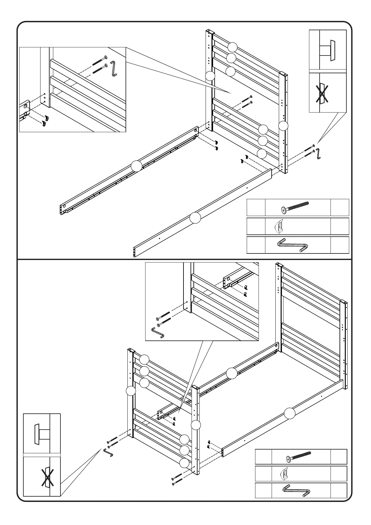 Attach bed rails (10,13 and 14) to legs (1,3)