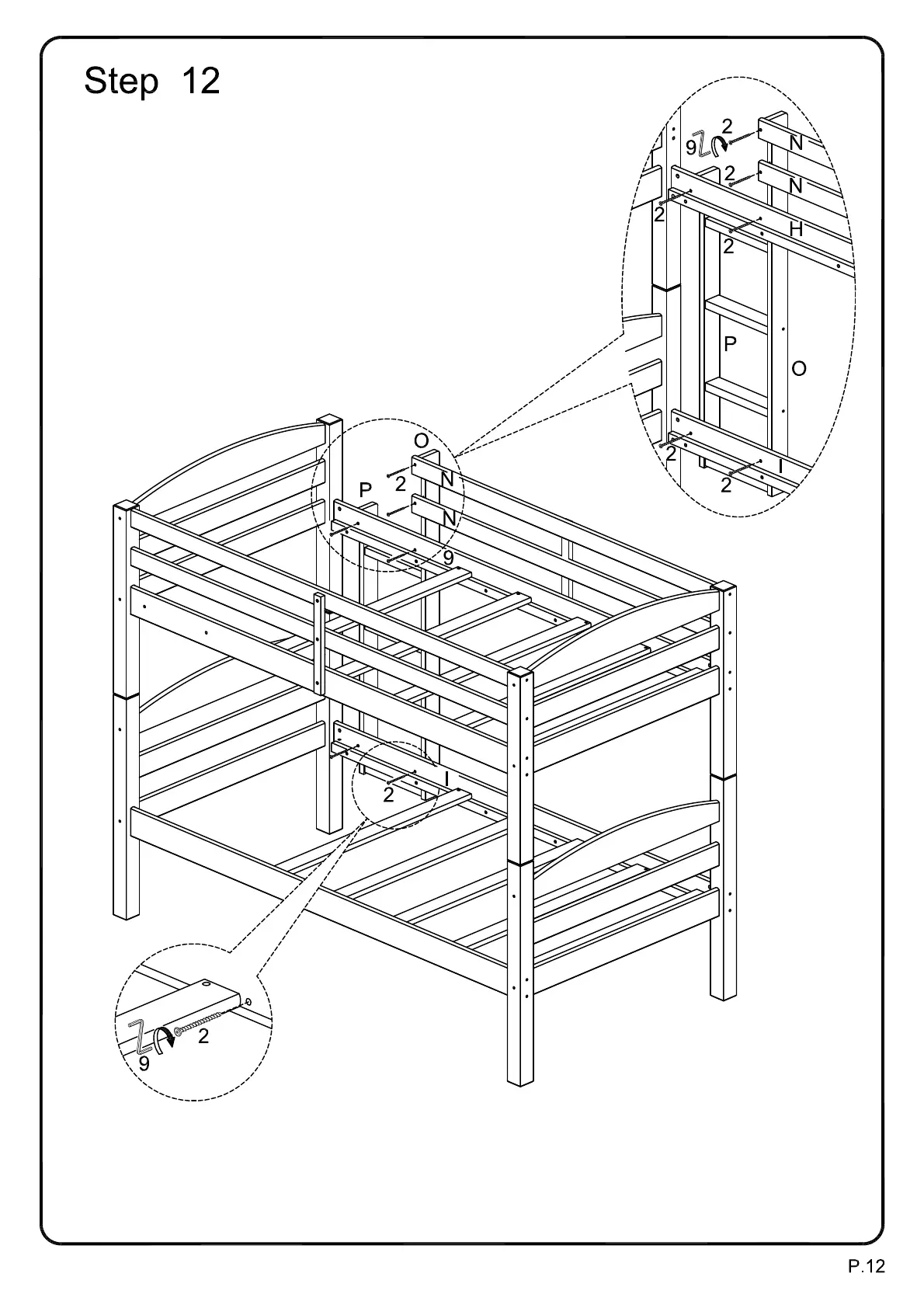 Secure ladder to the bed frame using joint connectors (2) as shown in the diagram.