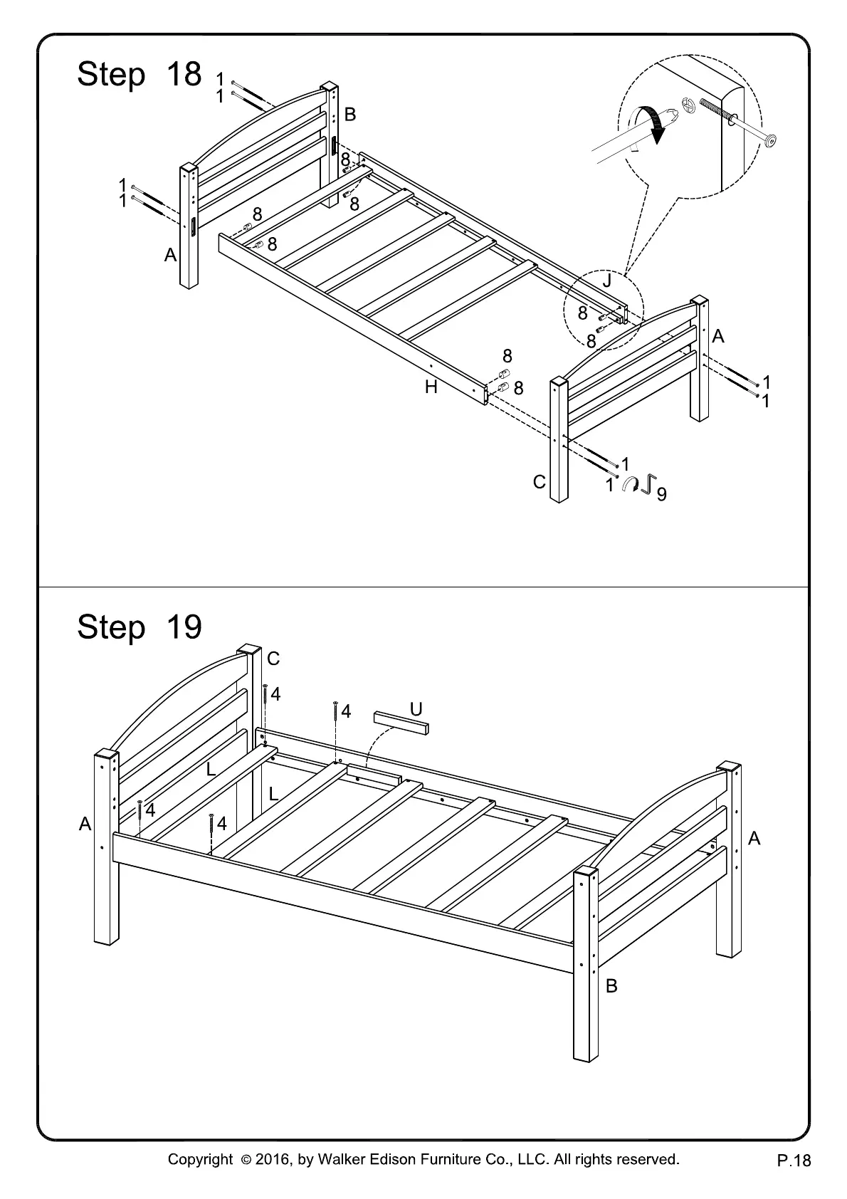Using the spacer (U) as a guide,secure slats (L) evenly spaced to the bed frame using large