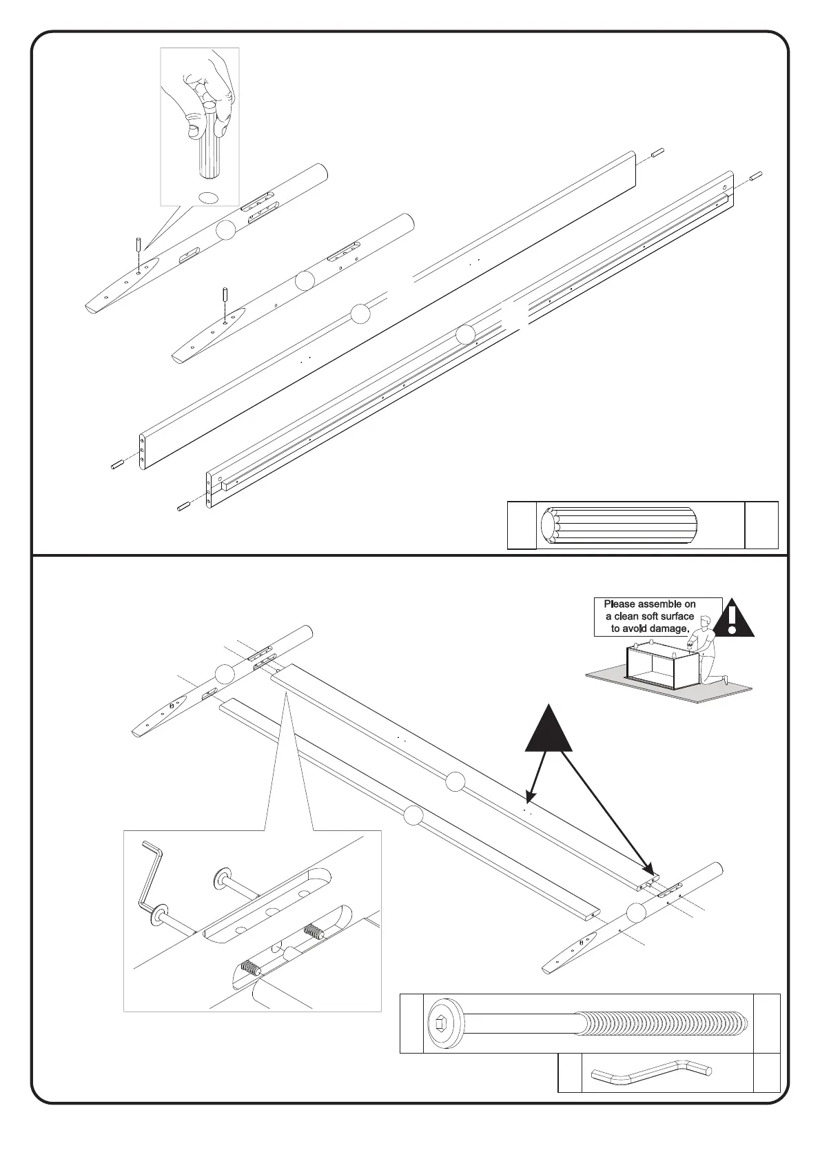 Insert the dowel K into parts 1, 3, 4 and 7