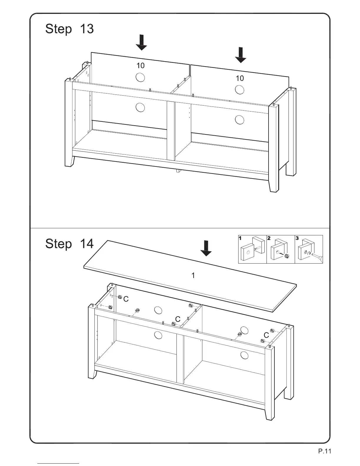 Carefully attach panel (1) to the assembly using cam bolts and dowels as guides. Insert cam locks (C) into