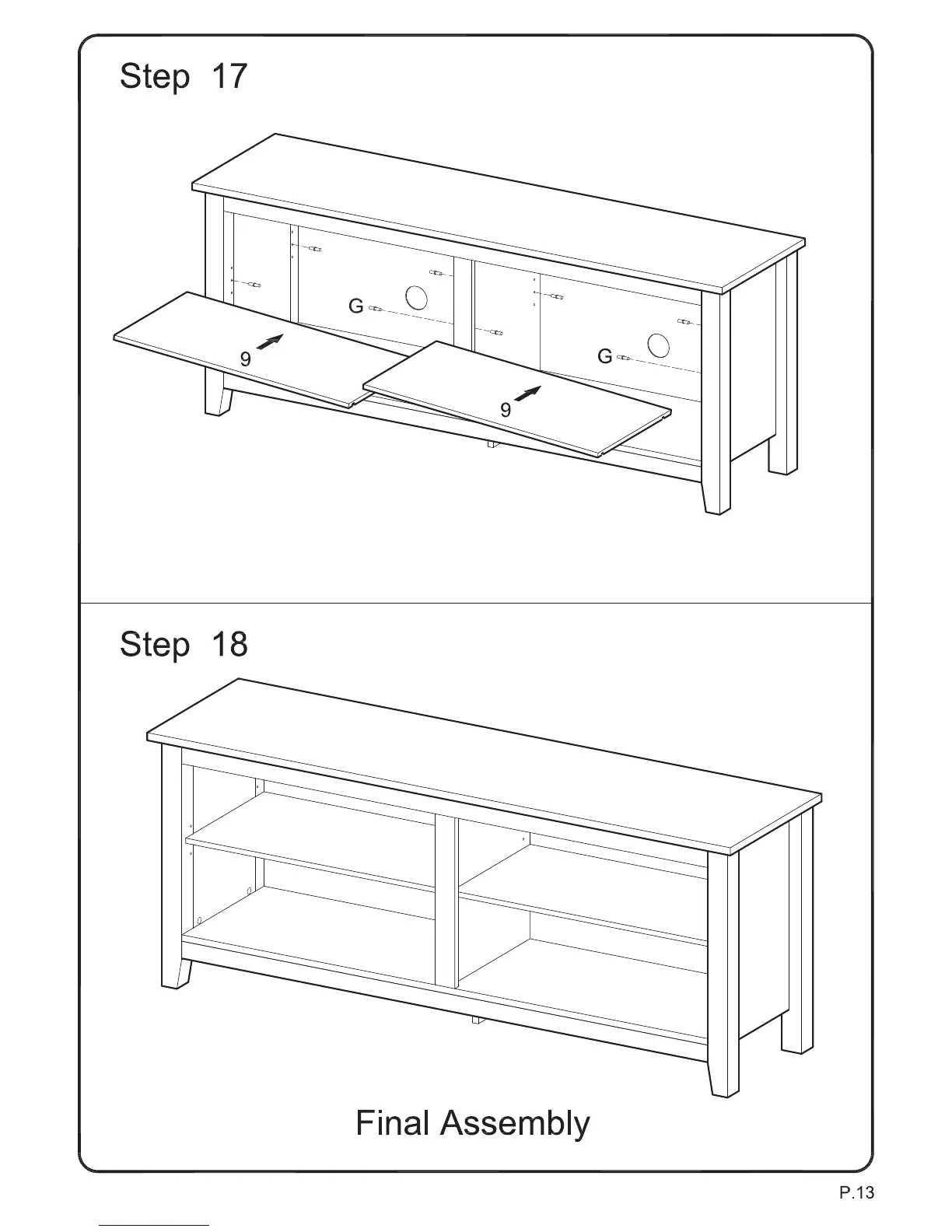 Insert shelf support pins (G) into the assembly at desired shelf heights. Carefully place shelves (9) on shelf