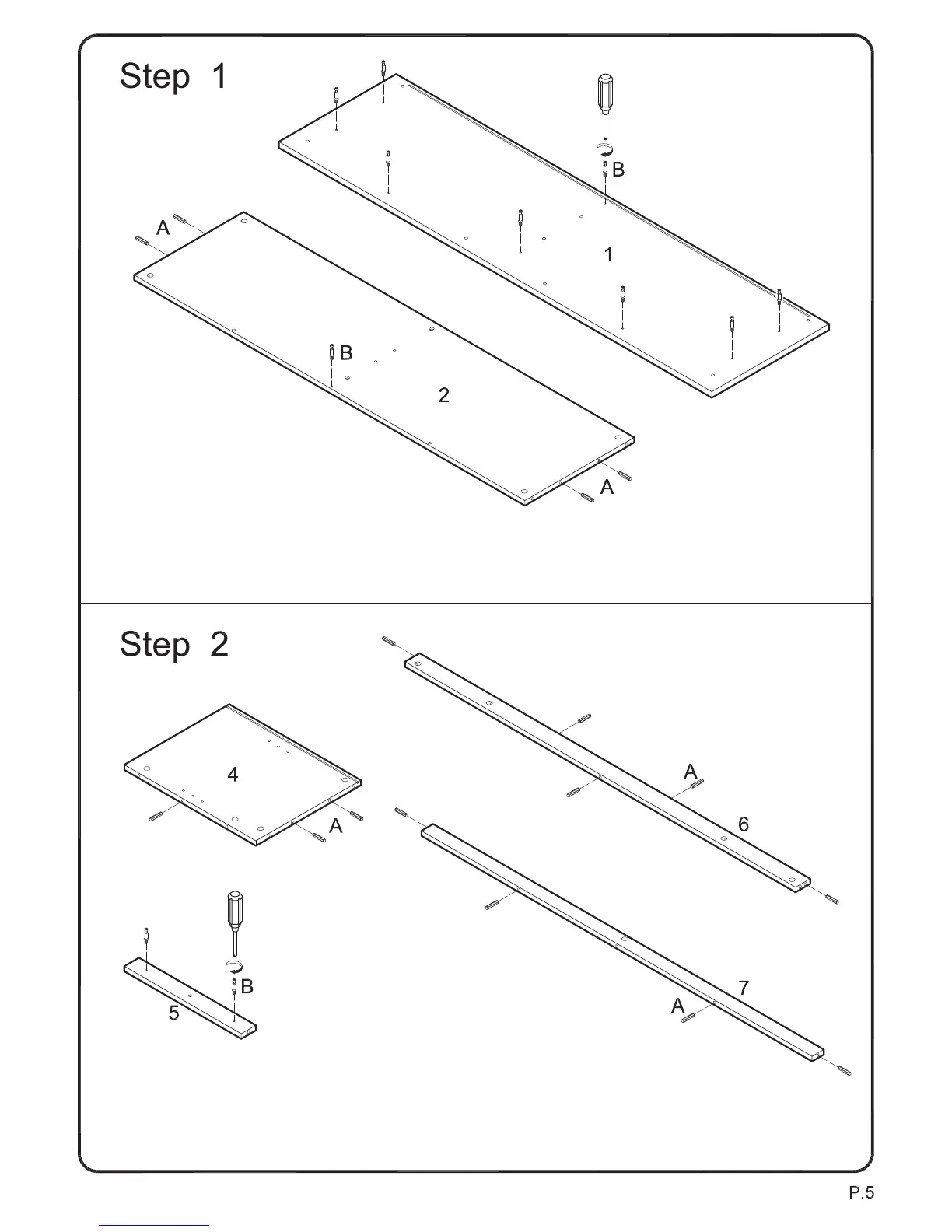 Insert dowels (A) into panel (4) and slats (6,7). Screw cam bolts (B) into slat (5).