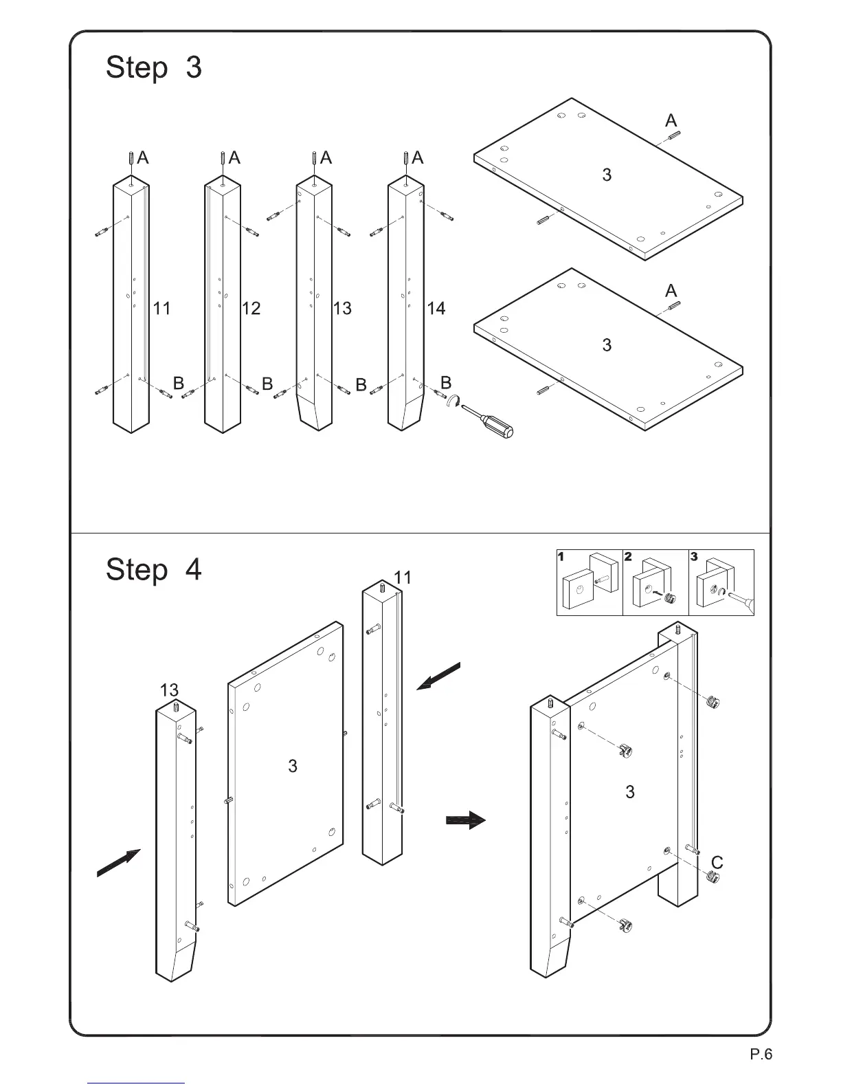 1,12,13,14) and panels (3). Screw cam bolts (B) into legs (1