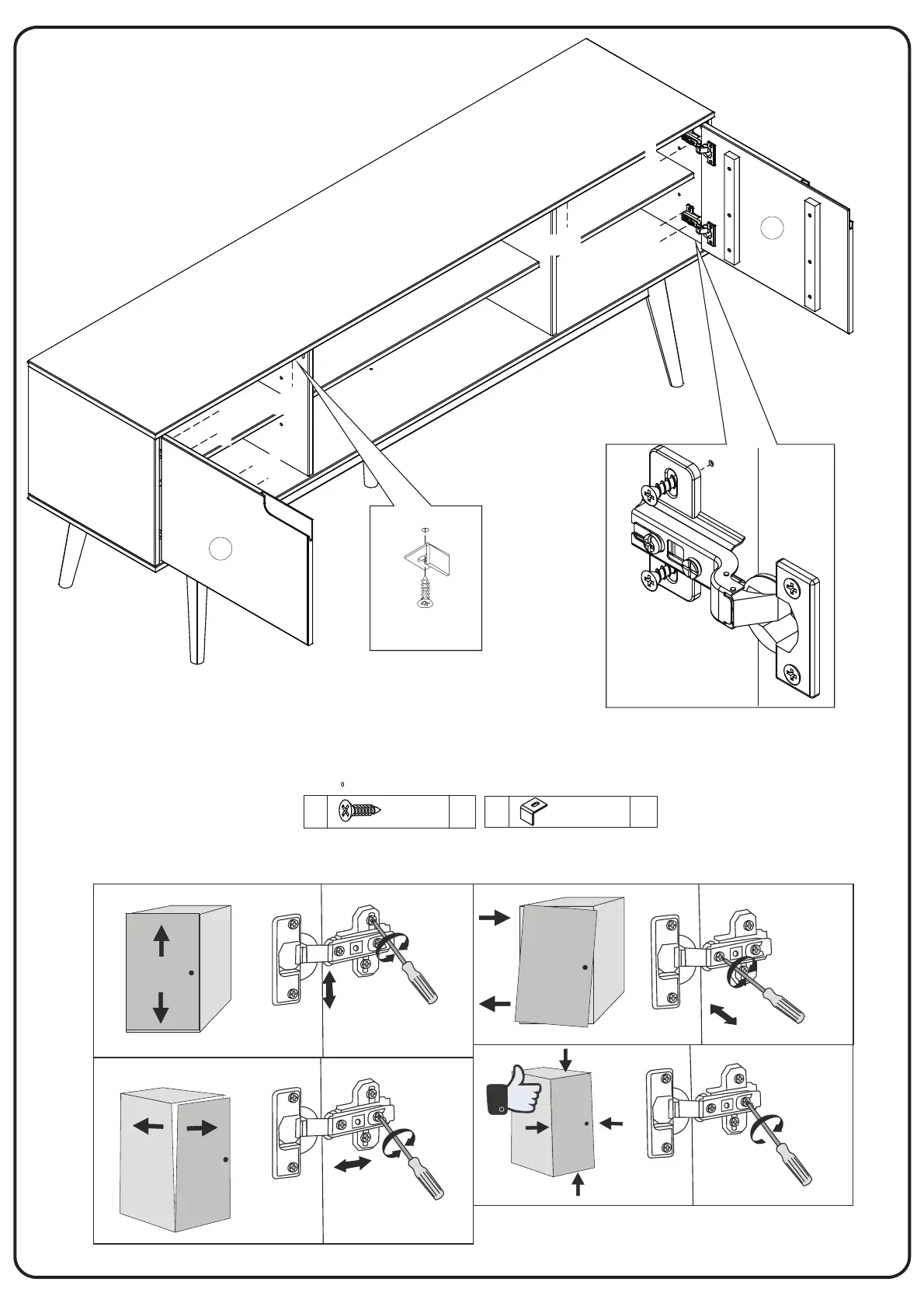 Attach hardware (L) part (1), with screw (H).