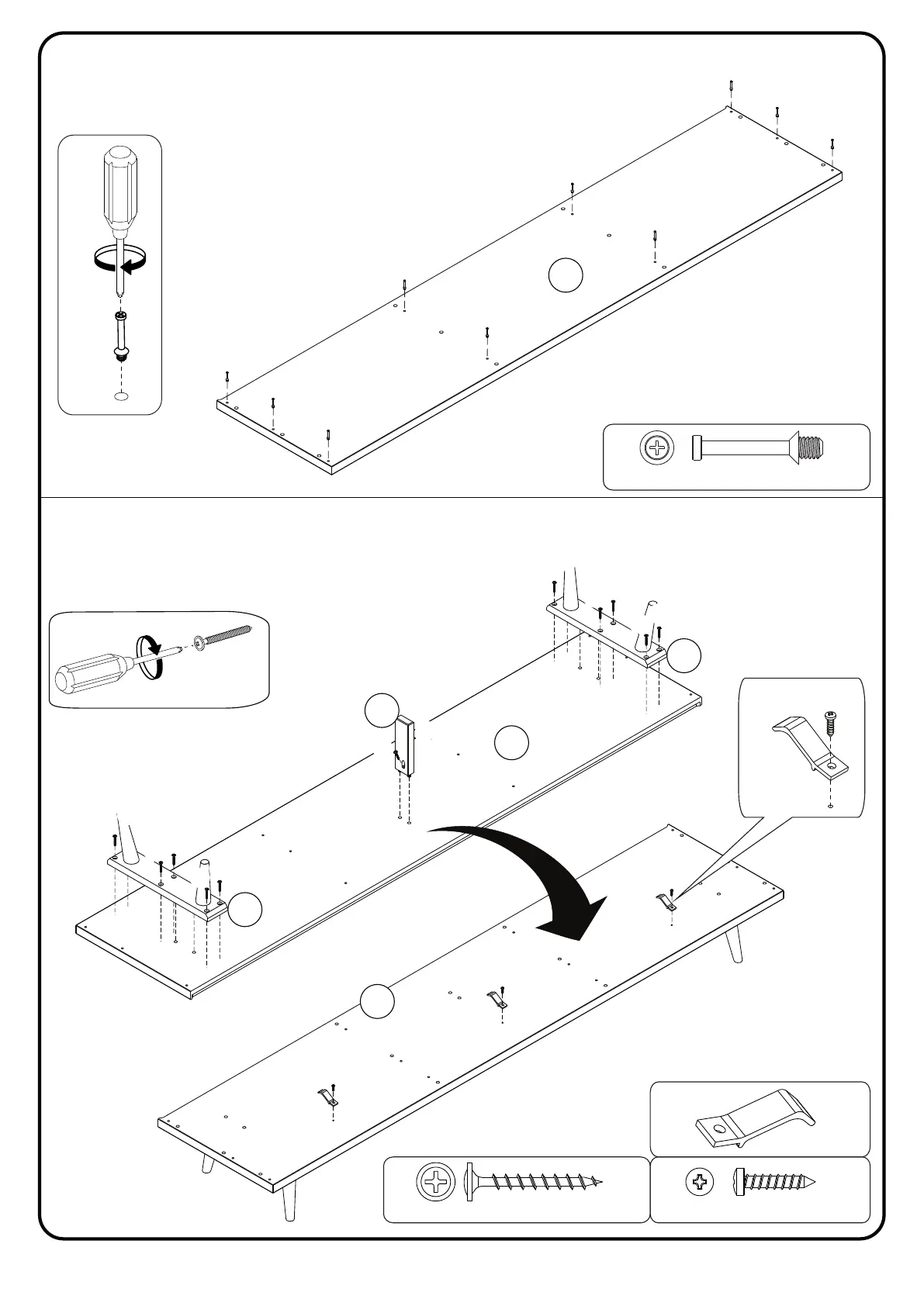 Walker Edison W70IV3D - Step 7: Attach Cam Bolts to Top Panel; Step 8: Attach Legs and Drawer Limiters
