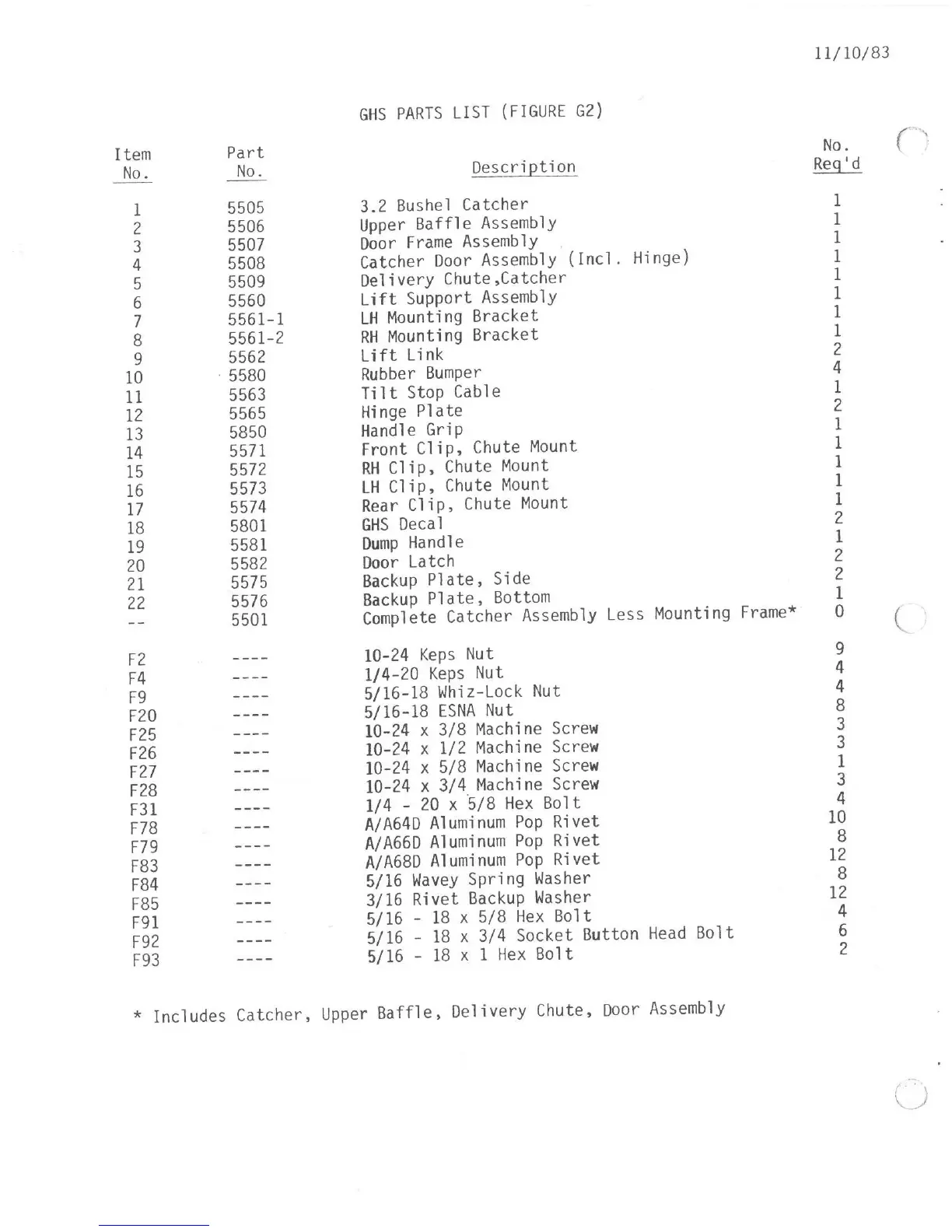 Walker M36-42 - GHS 3.2 Bushel Catcher Parts List (Figure G2)