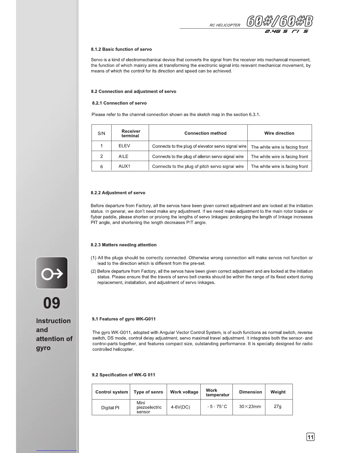 Walkera 60# - Servo Specification and Adjustment; Gyro Instruction; Gyro Features and Specification