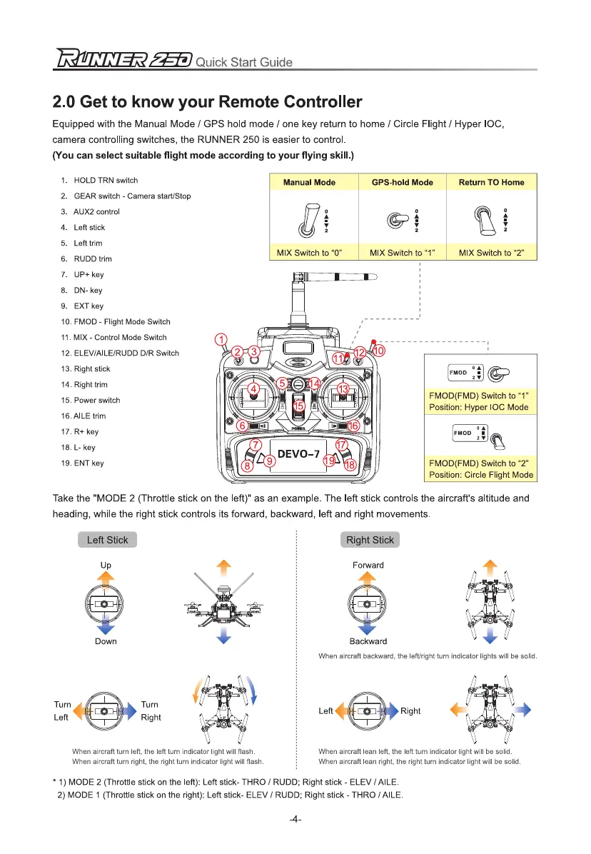 Take the "MODE 2 (Throttle stick on the left)" as an example. The left stick controls the aircraft's altitude and