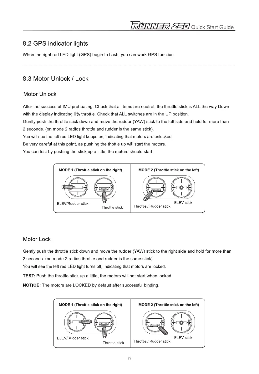 Gently push the throttle stick down and move the rudder (YAW) stick to the left side and hold for more than