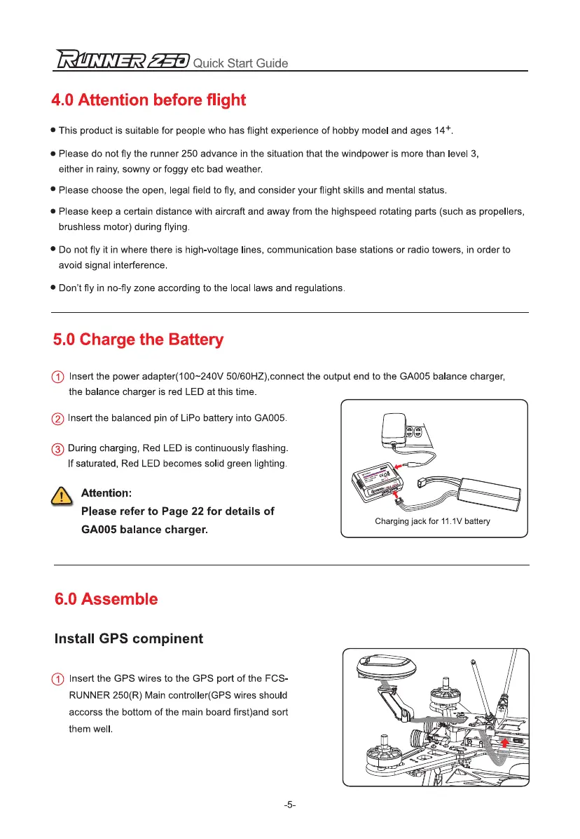 0 Insert the power adapter(100-240V 50/60HZ),connect the output end to the GA005 balance charger,