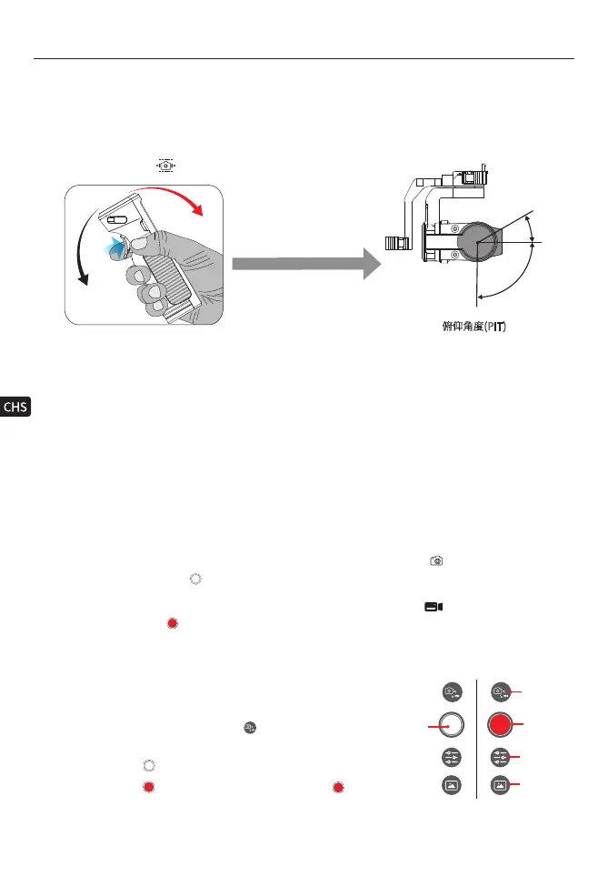音手柄体感控制或在移动设备APP界面相机视窗中控制云台的俯仰角度(PIT)。
