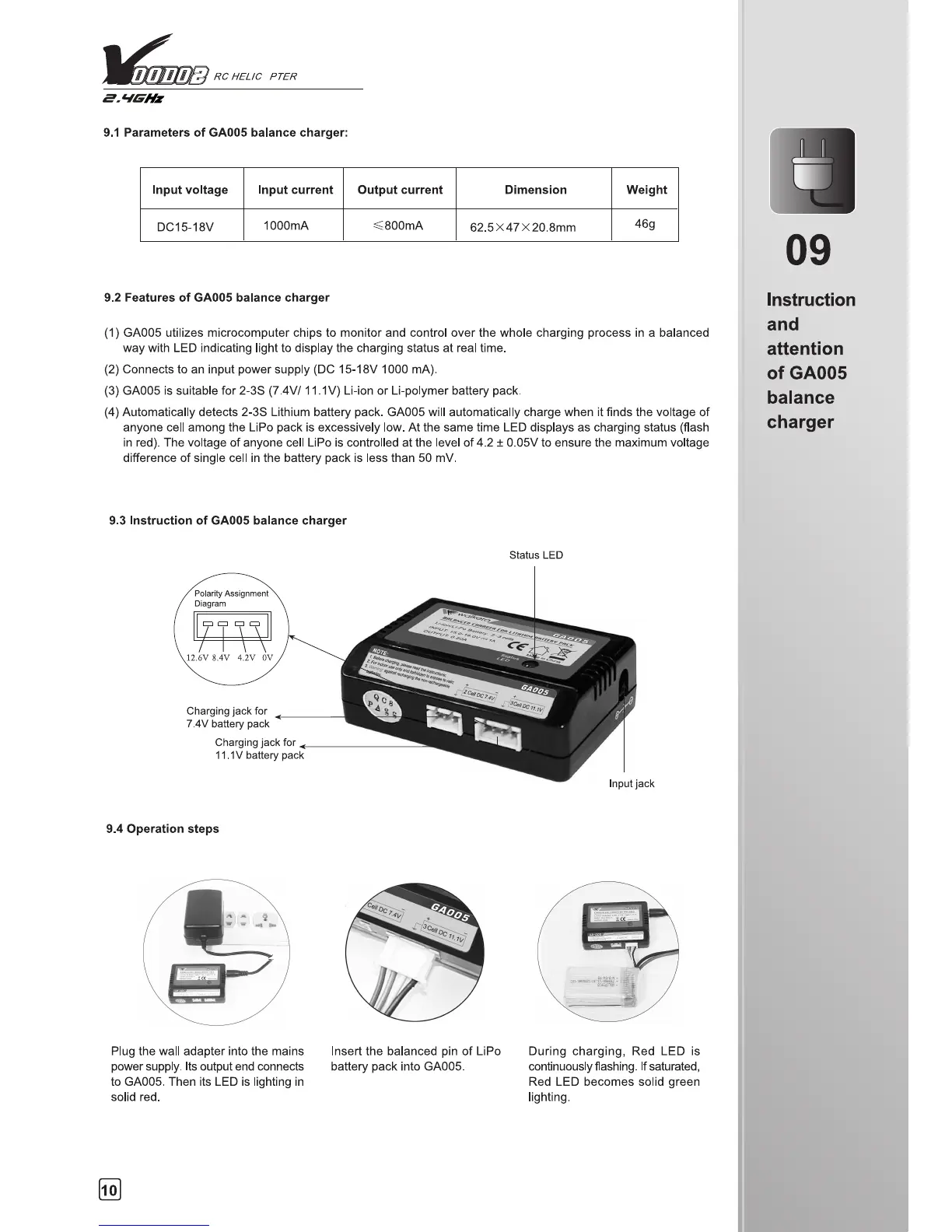 Walkera V400D02 - Instruction and Attention of GA005 Balance Charger; Features of GA005 Balance Charger; Operation Steps