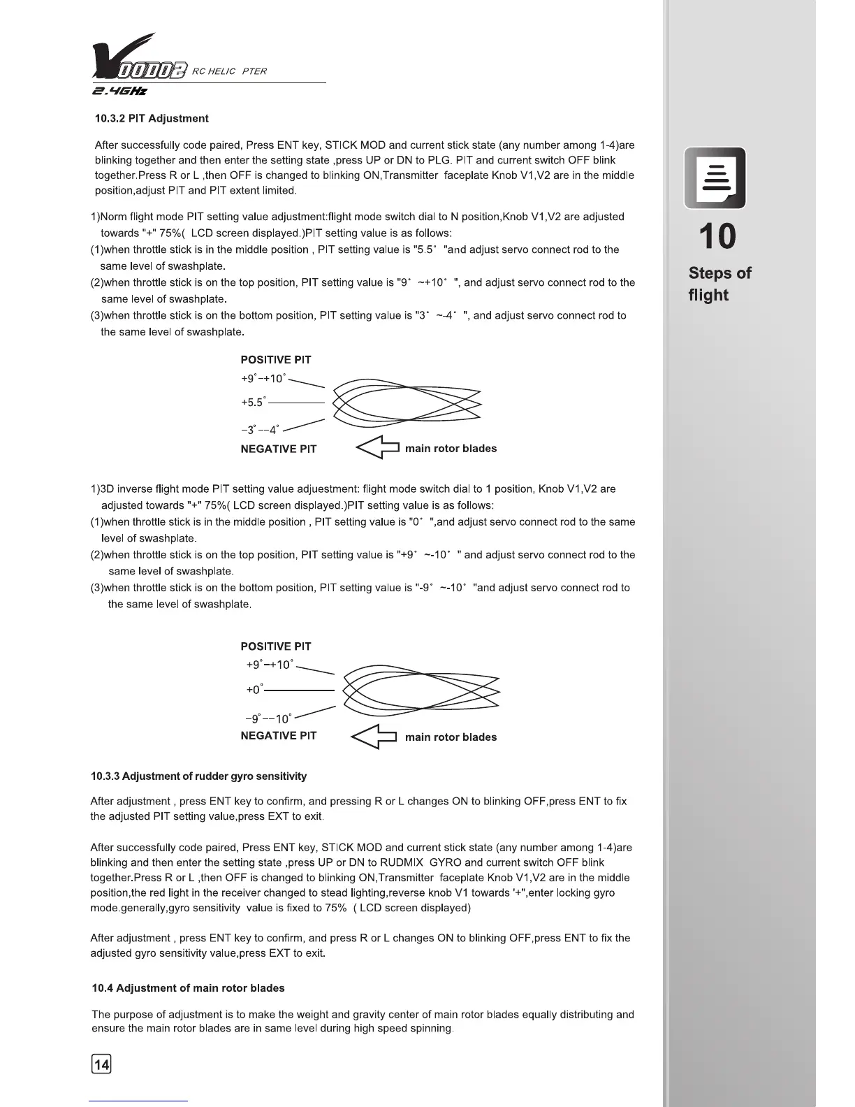 Walkera V400D02 - PIT Adjustment; Adjustment of Rudder Gyro Sensitivity; Adjustment of Main Rotor Blades; Appendix 1: Flight Control Modes