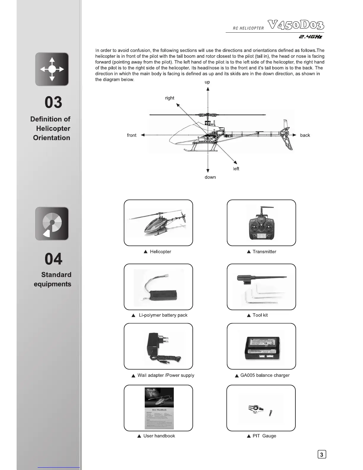 Walkera V450D03 - Definition of Helicopter Orientation; Standard Equipments