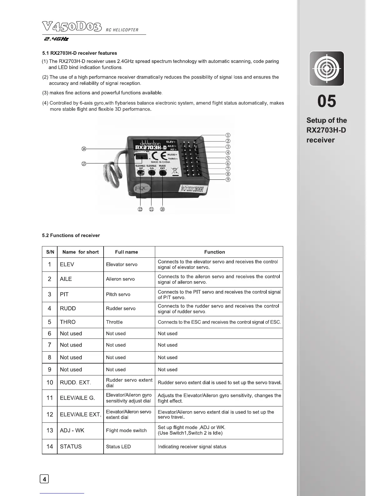 Walkera V450D03 - Setup of the RX2703 H-D receiver; RX2703 H-D receiver features