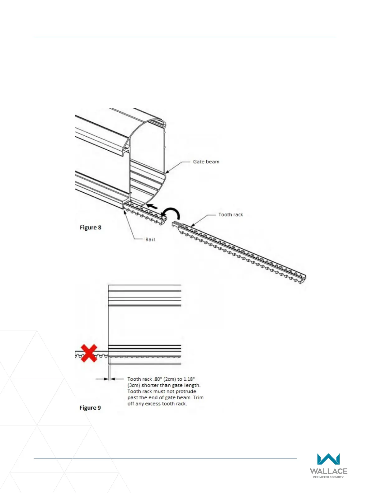 Hook tooth racks together and slide them into rail throughout the enre length of gate. See Figure 8.