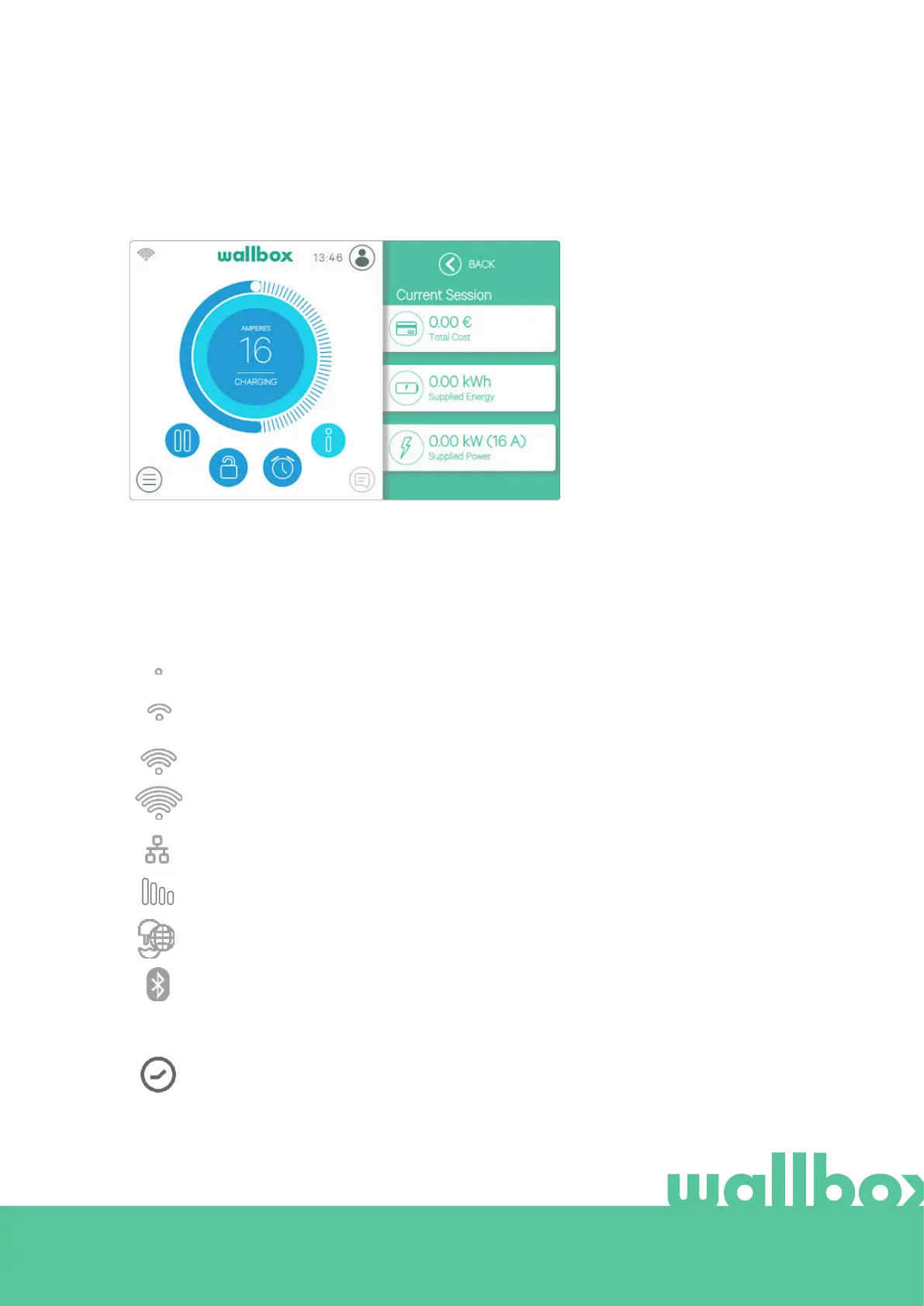 Information about the connectivity state and specific status on the charger is displayed as icons in the top