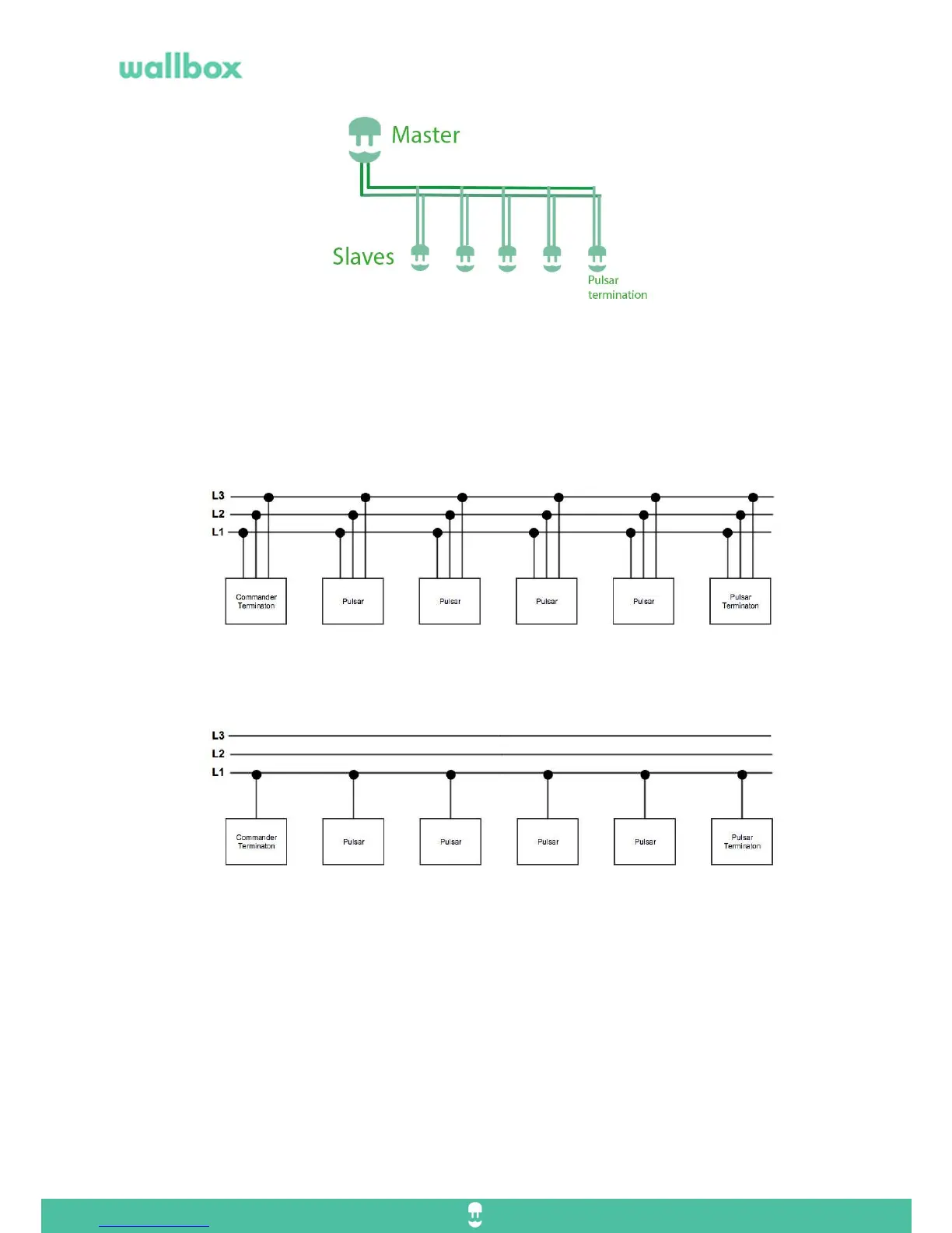 Diagram of connection for Power Sharing on single-phase. All chargers must be connected to same line.