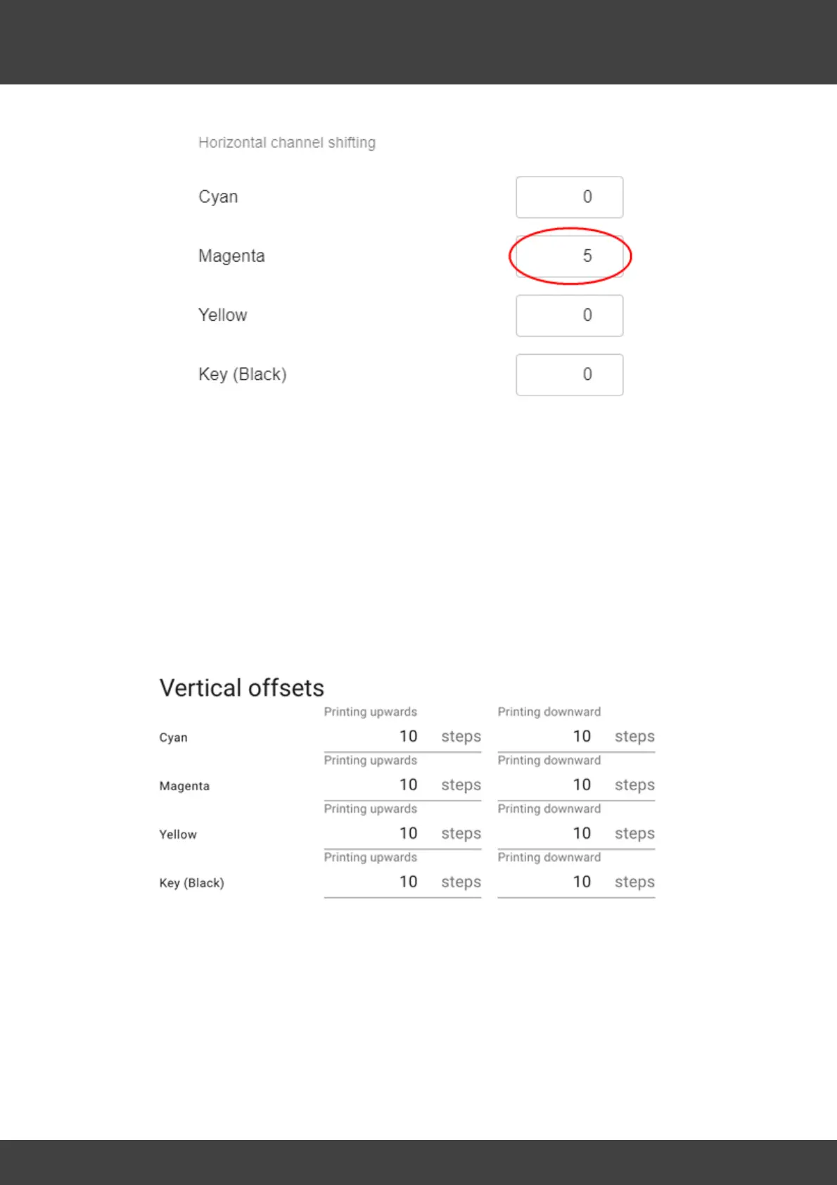 magenta printing upwards.