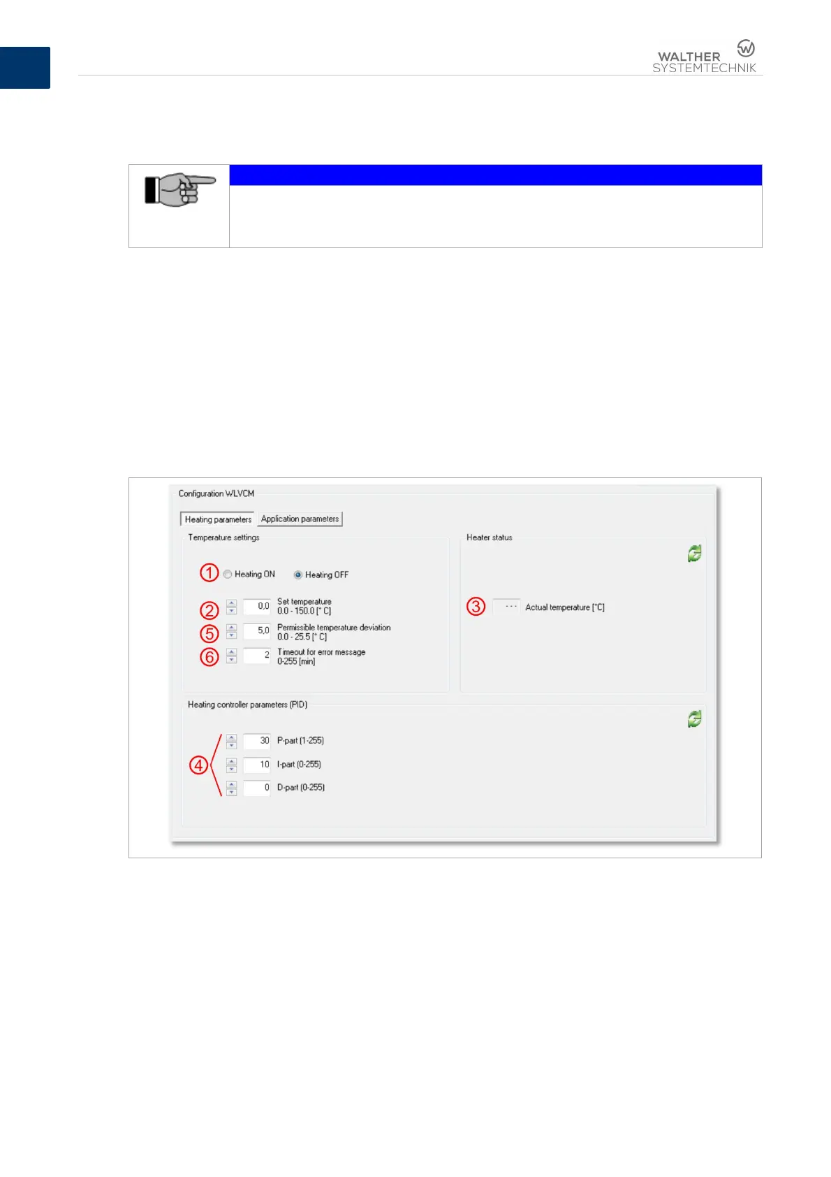 Use the heating parameter button for setting all parameters for temperature control in connection with
