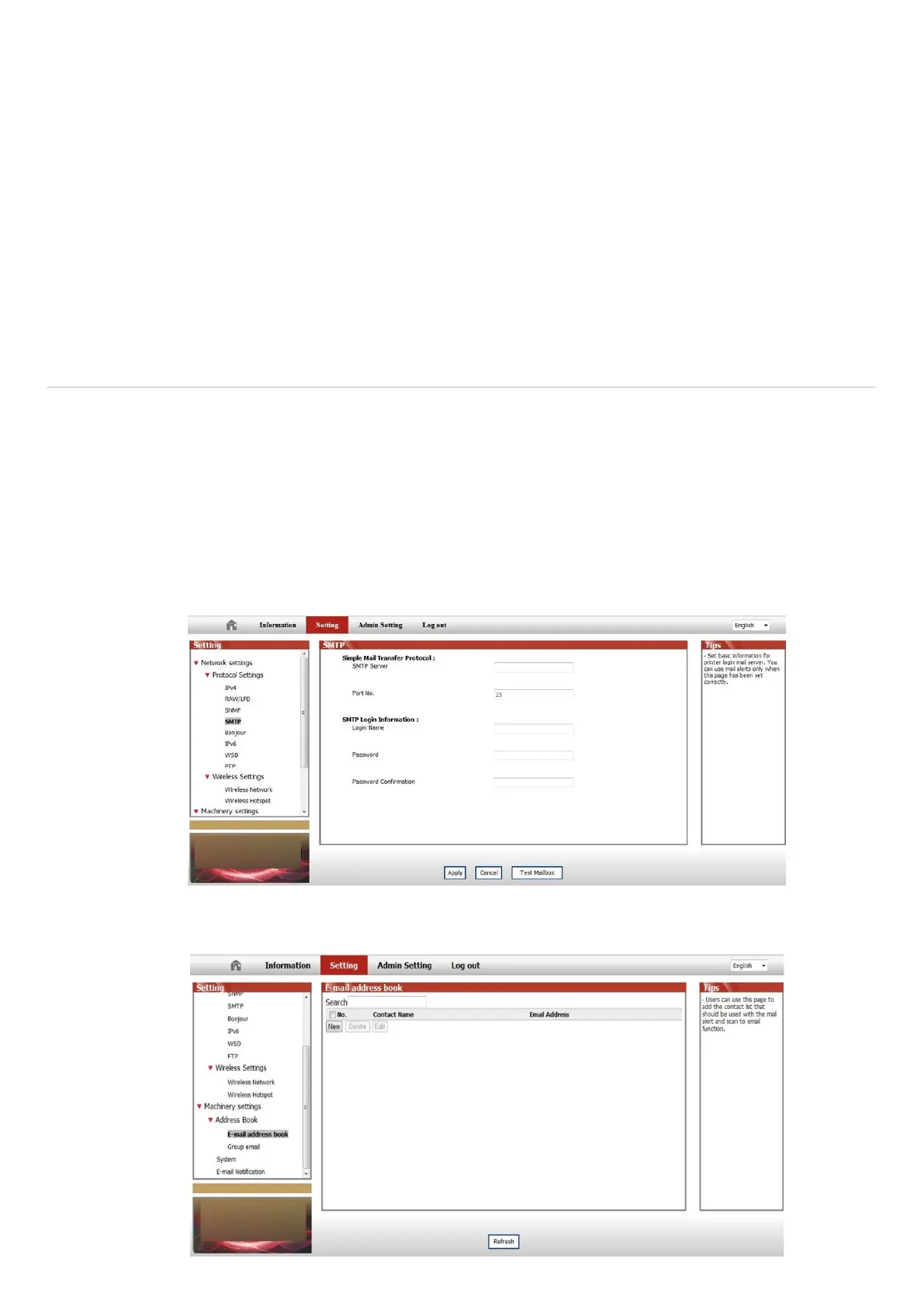 ② Click on "Setting"—"SMTP" to set the relative parameters of the SMTP Protocol; After finishing setting, click on "Apply"